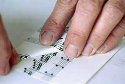 Installation avec sujets, réalisés avec des partitions de Mozart, caisse contenant des “Noctules“, pupitre à musique et un fragment de partition, tableau noir avec croquis à la craie