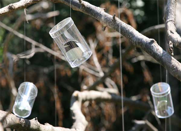 Boites rondes en plastique rigide accrochées aux branches, câble fin de pêche, 50 x 80 mm