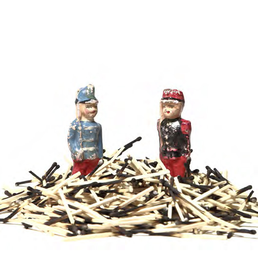 Les personnages sont des jouets en bois destinés aux jeunes garçons (vers 1900). Dans la sérénité familiale chacun pouvait organiser ses batailles sans imaginer les conséquences d’une Grande Guerre.