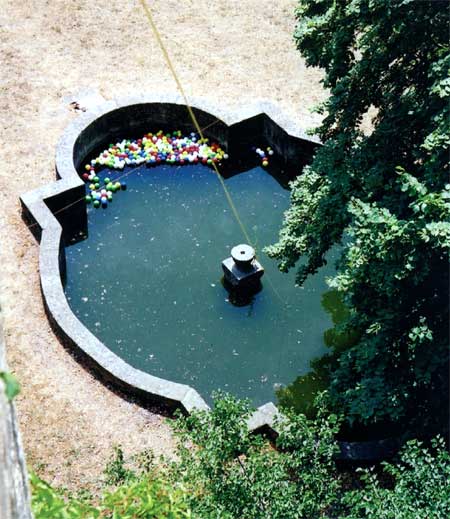 Bassin, boules en polystyrène (100 de ø 80 cm, 150 de ø 100 cm), cordelette (passage du fil d'Ariane)