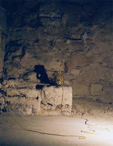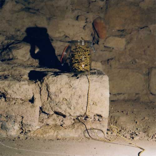 Bocal ø 10 cm, 18 cm, cordelette (arrivée du fil d'Ariane dans le bocal), cercle à la craie au sol