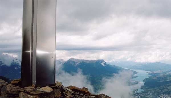 Une colonne miroir réfléchissant un point lumineux vers la vallée, du lever au coucher du soleil, variable suivant l'heure et les saisons est placée sur trois sommets de l'embrunais (le Morgon 2323 m, le Mont Guillaume 2542 m, l'Orel 2496 m (photo prise du sommet).