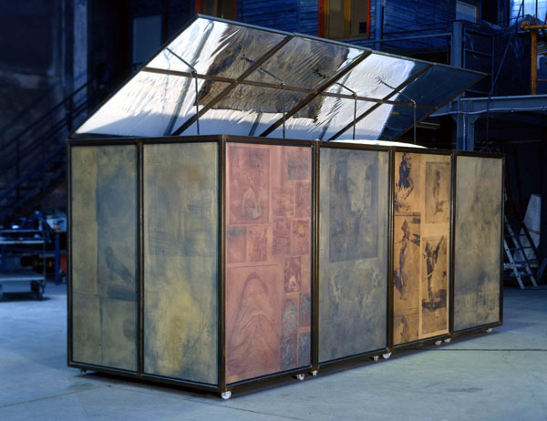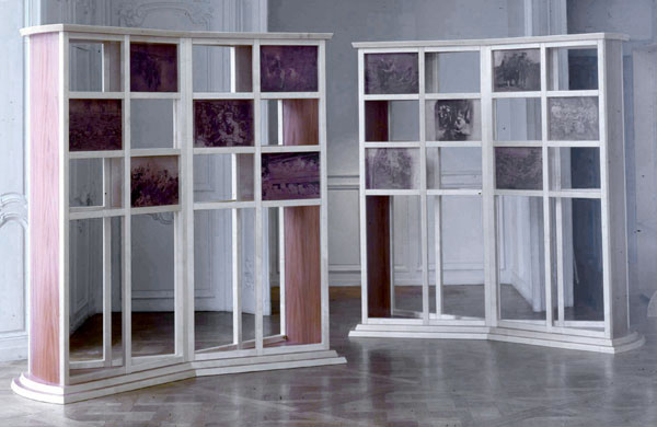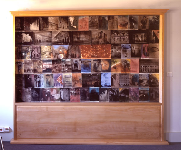 Résinotypes sur papier marouflés sur bois, retable en hêtre, 230 x 300 x 12 cm