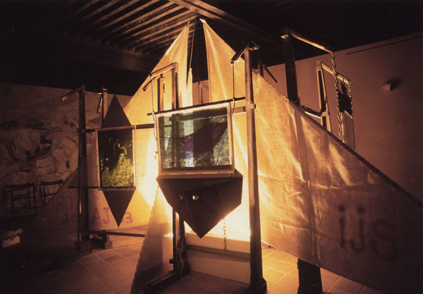 Installation, Cibachrome transparent, taules d'acier, chaînes, toile de lin, éclairage