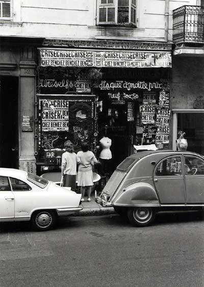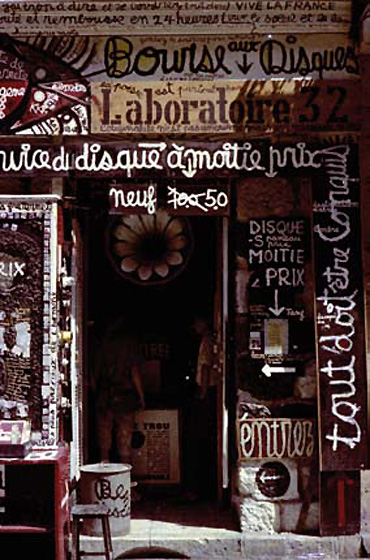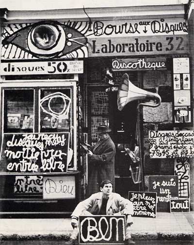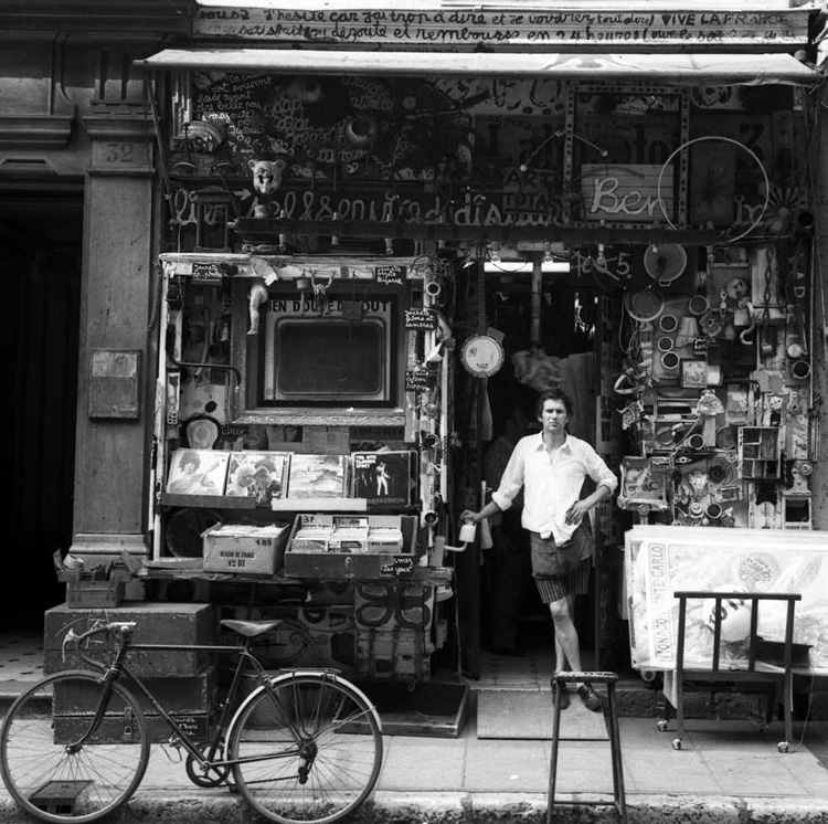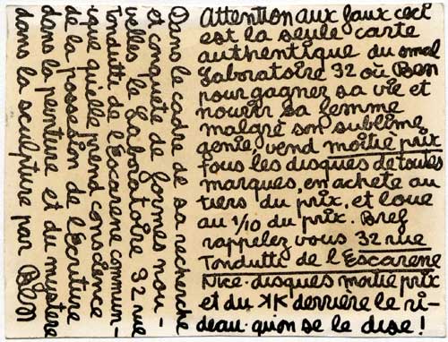 Peu de temps après je vendis cette librairie pour acheter un autre fond, 32, rue Tondutti de l'Escarène. Comme la papeterie ne marchait pas, je me mis à vendre des disques d'occasion et à décorer ma façade avec n'importe quoi. Un jour, Yves Klein vint dans mon magasin et je lui montrais mes dessins de la Banane. Yves Klein me dira: "Les bananes c'est du sous-Kandinsky, expose plutôt tes grands poèmes à l'encre de Chine, c'est plus authentique."