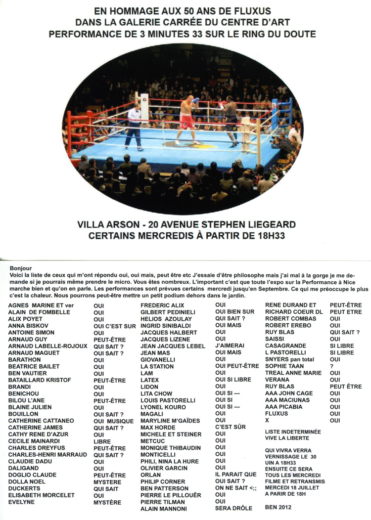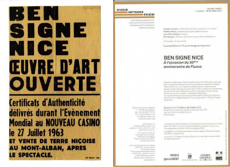 L’exposition Ben signe Nice (titre d’une oeuvre de 1968) sera constituée d’un ring de boxe entouré d’une tribune et de documents et d’objets fixés sur le murs. Le ring sera le théâtre d’actions que l’artiste souhaite organiser tous les mercredis à 18h aux mois de juillet et septembre. Chaque action sera réalisée en public, filmée puis retransmise en différé sur un écran placé au centre de l’installation. Le ring est identique à celui que l’artiste avait installé à Cologne lors de l’exposition Happenings and Fluxus organisée en 1970 par Harald Szeemann. Les documents sur les murs concernent la mémoire d’une grande partie de ses performances ou de celles qu’il a organisées sur la Côte d’Azur, tandis que les objets sont des artefacts d’idées qu’il inventorie au fil du temps, partitions possibles pour de futures actions intimes ou publiques. Enfin, l’artiste a souhaité inscrire sur un des murs de la galerie carrée un texte sur sa définition de la performance.