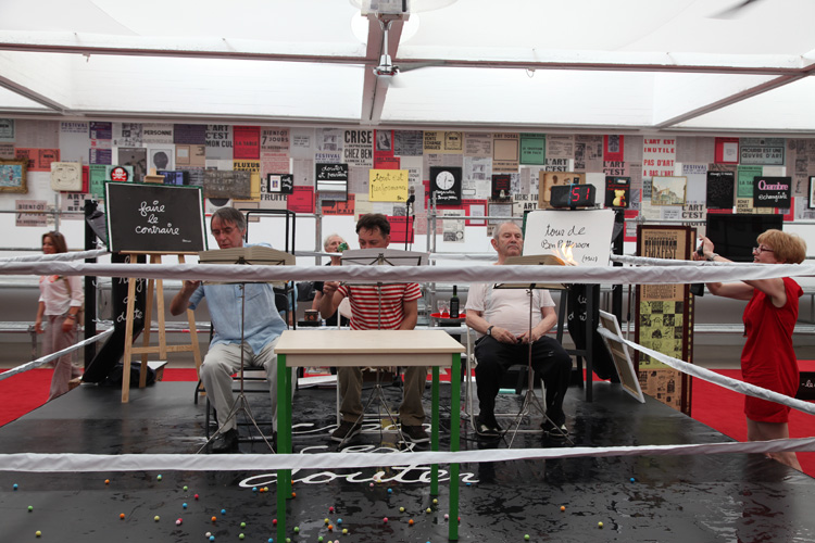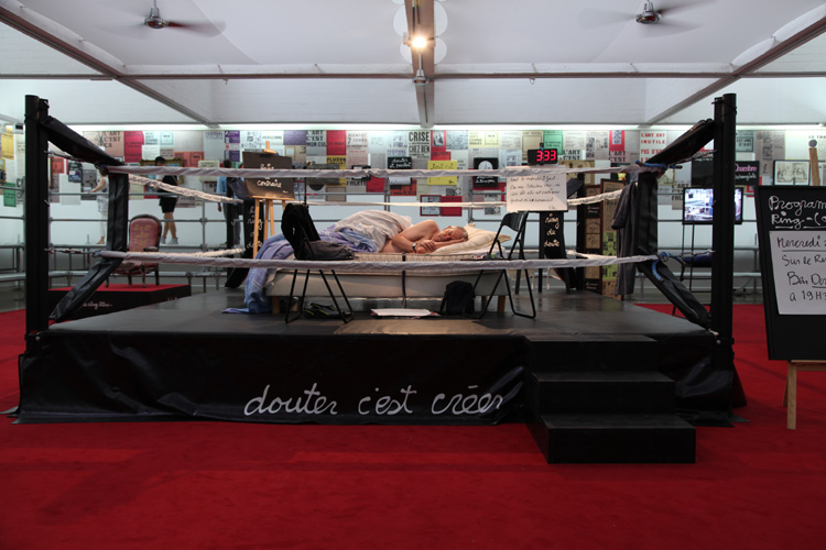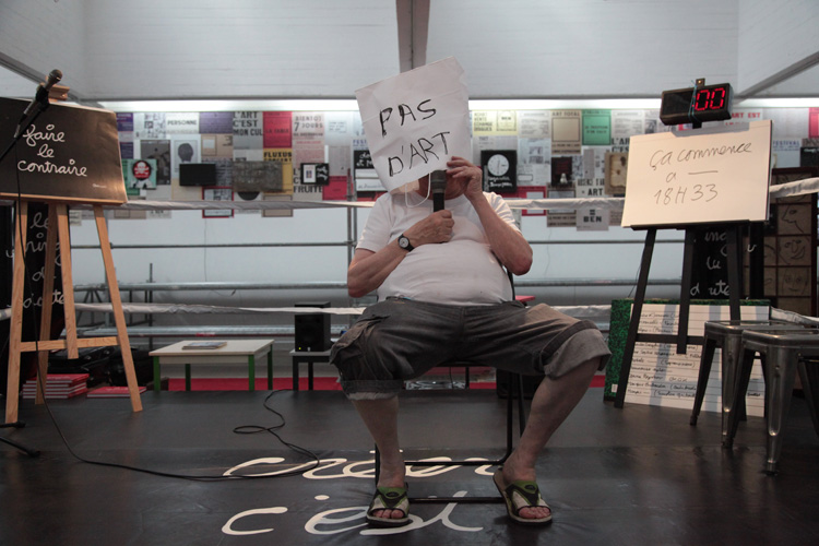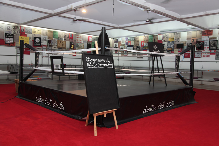 Un ring de boxe entouré d’une tribune, de documents et d’objets – mémoire de ses performances et de celles organisées sur la Côte d’Azur ou produits dérivés d’idées que l’artiste inventorie – est le théâtre d’actions que Ben organise tous les mercredis à 18h (en juillet et en septembre). Chaque action sera réalisée en public, filmée puis retransmise en différé sur un écran placé au centre de l’installation. Ce ring est identique à celui que l’artiste avait installé à Cologne lors de l’exposition Happenings and Fluxus organisée en 1970 par Harald Szeemann. La Villa Arson rend ainsi hommage à Ben à l’occasion du 50ème anniversaire de Fluxus et dans le cadre du programme de recherche qu’elle mène depuis 2007 – grâce au soutien constant du Conseil Général des Alpes-Maritimes – sur l’histoire de la performance sur la Côte d’Azur de 1951 à nos jours. |