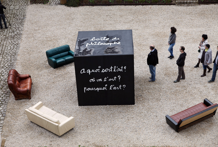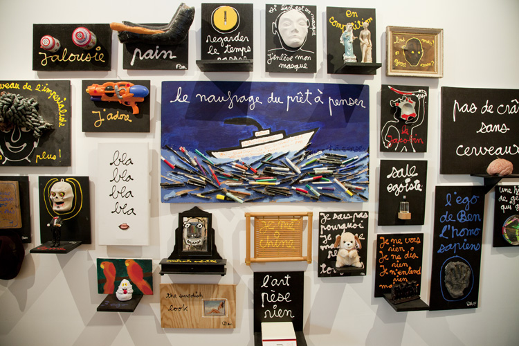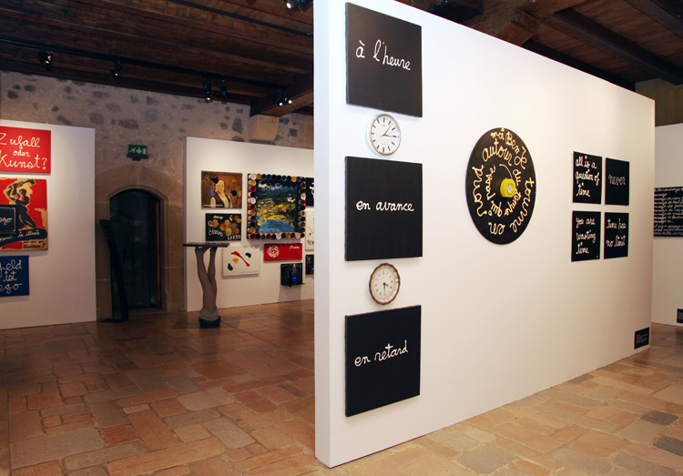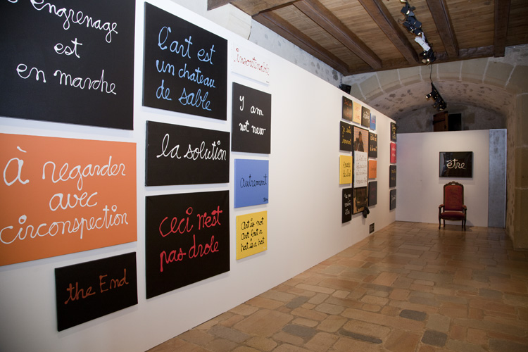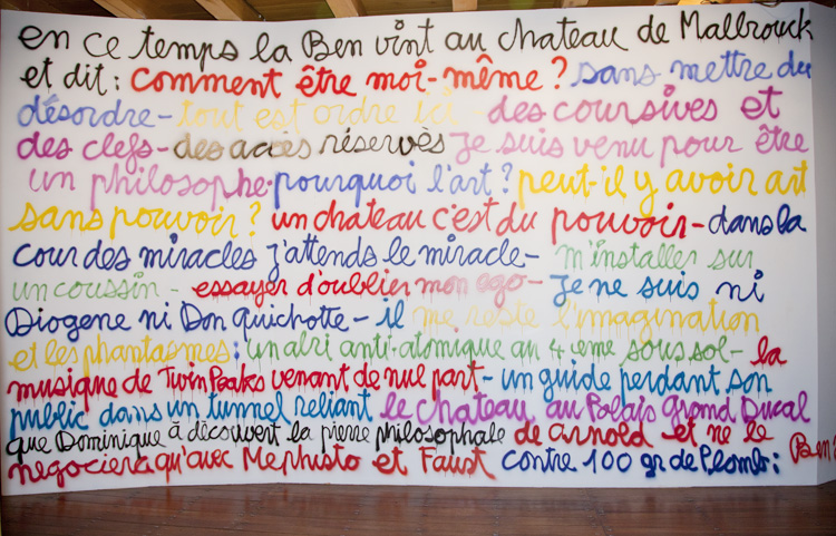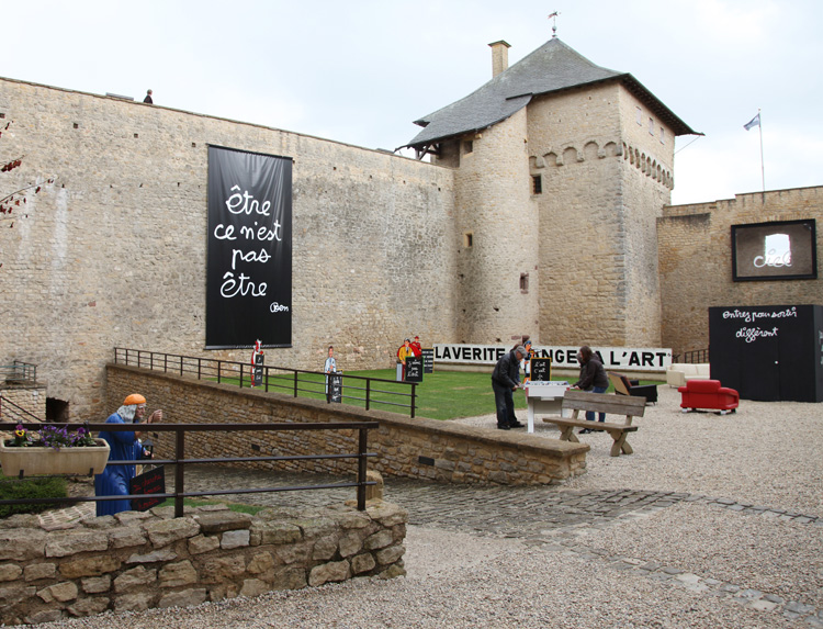 L'exposition investit les espaces du château de Malbrouck. Ben y a installé la plus grande "cour de (ré)création" où prés de 250 oeuvres, (peintures, illustrations, installations, sculptures) se donnent à voir. Le postulat de départ se veut existentiel. "Etre", invite le visiteur à explorer la question philosophique ontologique posée par l'art, en général. |