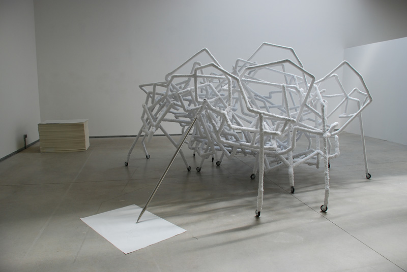 Construction réticulaire générée par un système de connexions synaptiques, la forme de With Sarah évoque un énorme cerveau, comprenant en son centre un espace de sommeil. Constituées de roues et d’une mine de plomb, les extrémités en contact avec le sol esquissent un dessin lorsque la structure se déplace. Un principe qui rappelle les outils utilisés par les spirites pour faire dessiner les esprits, et qui fut à l’origine des plans de construction de la «maison sans fin» de Sarah Winchester. Cette veuve, convaincue que des esprits allaient la tuer si la construction de sa maison en Californie était finie, a poursuivi pendant trente-huit ans, de manière ininterrompue, 24 heures sur 24, la construction de sa maison. Architecture générant de l’architecture, ce Ouija à taille humaine trace les «lignes d’erre» de nos voyages somnambuliques. |