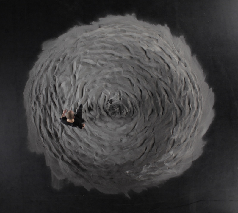 Timezone met en scène un homme marchant dans du sable gris. Filmée de haut, la spirale de matière se scinde au fur et à mesure de la déambulation en deux demi-cercles: l’un noir, l’autre blanc. L’œuvre renvoie explicitement à l’expérience imaginée par Robert Smithson pour expliquer le principe de l’entropie, autrement dit l’irréversibilité du temps dans la désagrégation d’un système: «Imaginez le bac à sable divisé en deux, avec du sable noir d’un côté et du sable blanc de l’autre. Prenons un enfant et faisons-le courir des centaines de fois dans le sens des aiguilles d’une montre à l’intérieur du bac jusqu’à ce que le sable se mélange et commence à devenir gris. Ensuite, faisons-le courir dans le sens inverse, le résultat ne sera cependant pas une restauration de la division d’origine, mais un degré de gris plus intense et un accroissement de l’entropie. Bien sûr, si l’on filmait une telle expérience on pourrait apporter la preuve de la réversibilité de l’éternité en montrant le film en sens inverse, mais alors tôt ou tard le film lui-même s’effriterait ou se perdrait*...» Tout en donnant corps à l’expérience, Timezone modifie le sens initial du mouvement. La marche «réparatrice» vers l’ordre originel est ici la restitution d’un déplacement qui s’est fait à reculons. À travers ce personnage devenu horloge humaine, le temps est retourné comme un gant pour illustrer un avancement (impossible) vers le commencement.