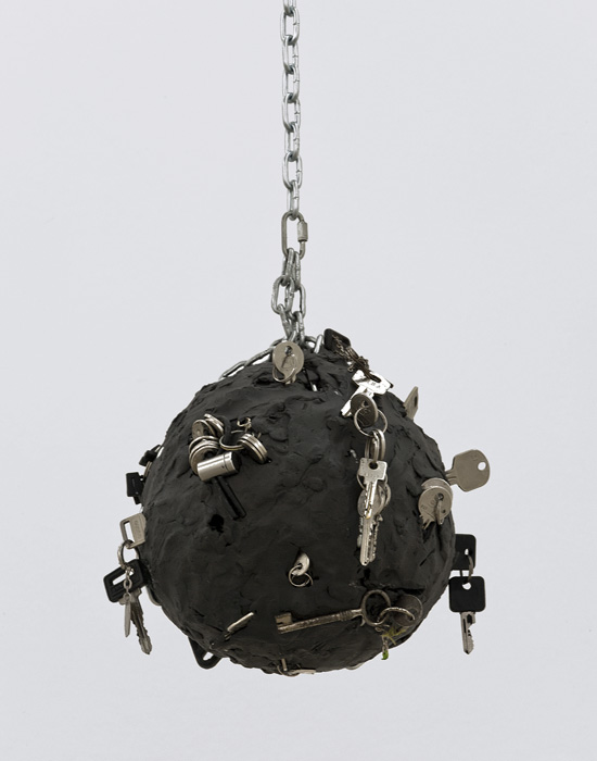 Trou noir est une boule de plastiline noire, suspendue par une chaîne. Des clés de différents types s’y retrouvent engluées, chacune correspondant à un oubli ou une disparition. De la taille d’une tête, Trou noir figure les amnésies, les pertes de mémoire et de tous les lieux qui ne sont plus accessibles, qui ont été oubliés et qui ne constituent désormais que des architectures mentales, des fantômes d’espaces. |