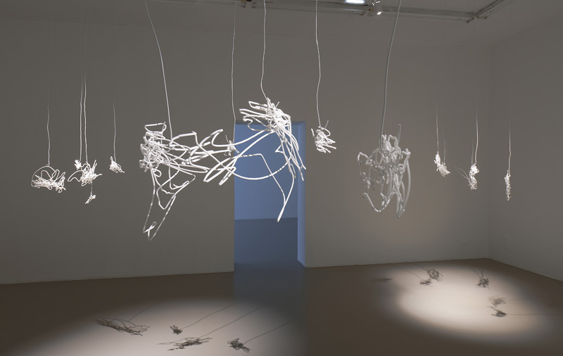 Traduction en paroles «solides» de discours d’Hélène Smith prononcés en langue martienne*. Cette translittération est possible à l’aide de capteurs et d’un logiciel permettant la retranscription en trois dimensions de ces paroles. Dessins abstraits déployés dans l’espace, ces formes ectoplasmiques, ces «paroles gelées», sont le fruit d’une technologie de pointe qui permet de comprendre les mécanismes de la parole. Elles nous renvoient de façon amplifiée à l’énigme du langage, matérialisant la parole de l’alien qui est en nous et occupe notre grotte buccale. |