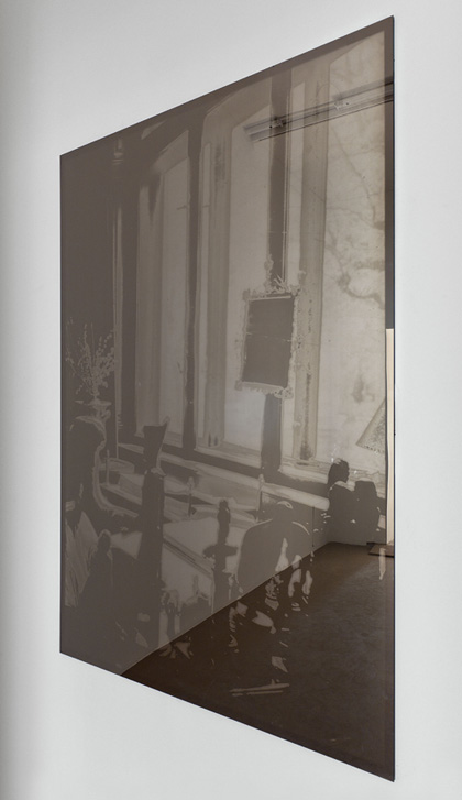L’image imprimée sur le miroir sans tain provient du recadrage d’une photographie du cabinet de Sigmund Freud. Conservée au Freud Museum, et restituée ici à travers le détail de la fenêtre, cette photographie a été prise en 1938 par Edmund Engelman, quelques jours seulement avant le départ de Freud pour l’Angleterre. L’étrange dispositif optique mis en place par le psychanalyste en accrochant un miroir à sa fenêtre est «amplifié» par l’impression de cette image sur un miroir. Sans matérialité, imprimée au dos du miroir, Salle de consultation devient une image spectrale. Le miroir renvoie à ce qui n’est pas visible et le visiteur se retrouve à la fois dedans et dehors. Cette image-espace joue ainsi sur différents niveaux de réflexion et génère des espaces cachés, induisant un principe d’autoconsultation. |