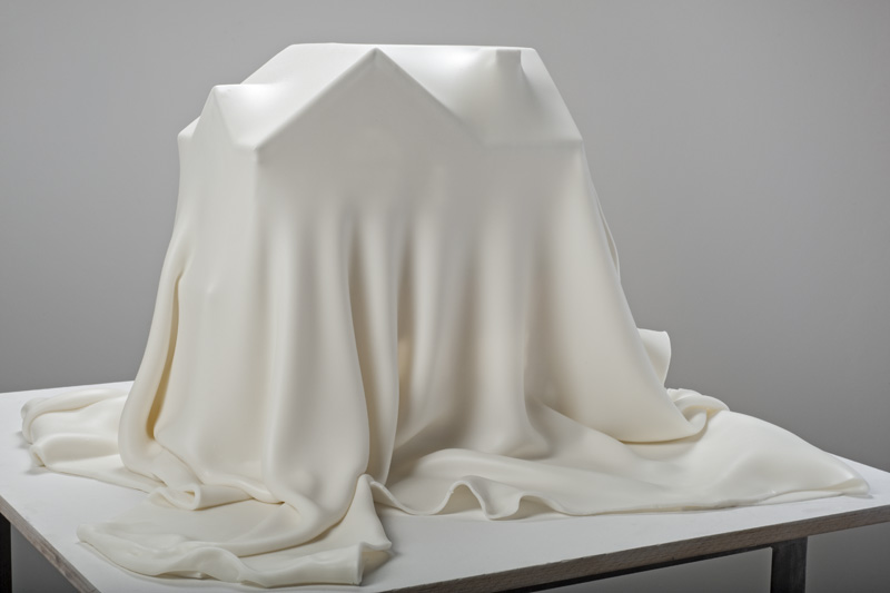 Réalisé en cire, un voile vient recouvrir l’intégralité d’un bâtiment indéterminé. |