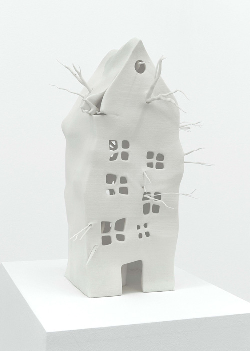 Les «sculptures» de résine ainsi produites, d’un blanc immaculé, prennent des aspects anthropomorphiques (toits troués, formes molles, façades dont s’échappent les branches...) et forment autant de fantômes, de rêves ou de cauchemars d’architecture psychotique. |