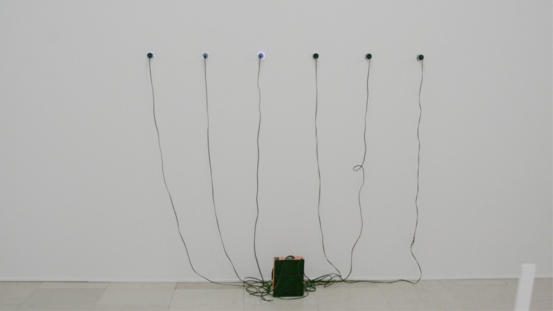Les EVP (Electronic Voice Phenomena) se manifestent par un magma sonore sur les bandes magnétiques ou dans les interstices des fréquences radio. Dans ce diptyque, la traduction des paroles fantômes «I’m just over her head» et «Mom... I’m all that’s left» (enregistrement fait le 11 mars 1993 à Danbury, dans une maison hantée, par le Connecticut Paranormal Research Society) est réalisée par l’intermédiaire d’un dispositif lumineux. Le signal est en quelque sorte «recrypté» et «réexpédié», non pas au spectateur mais aux limites de l’espace. |