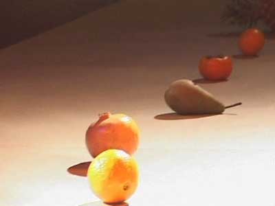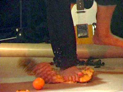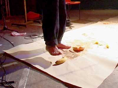 Écrire avec mes pieds en écrasant les fruits de saison et en les interpellant :