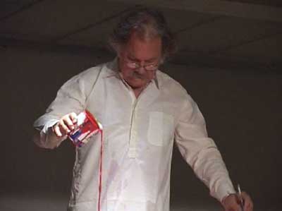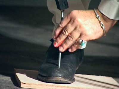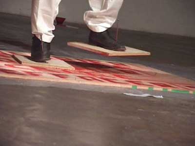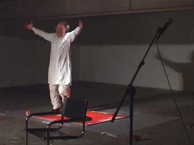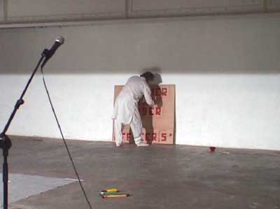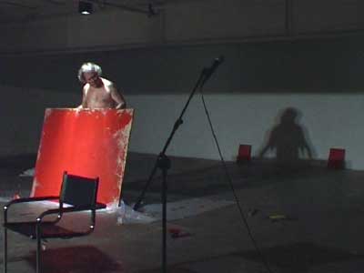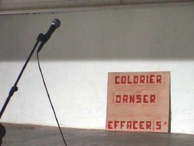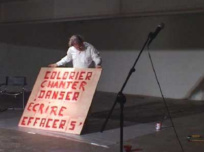 Se clouant les pieds sur deux planchettes, écraser de la peinture jusqu'à l'effacement des verbes écrits : danser, colorier, peindre, écrire, dire, crier. Toutes ces activités sont, en effet, un seul geste.