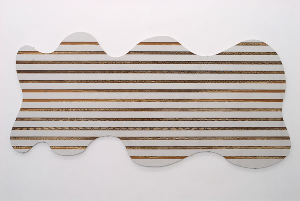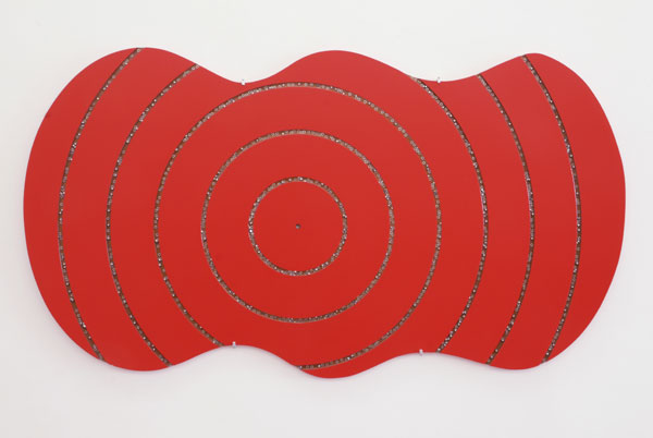 Encadrant Off, deux pièces murales utilisent effectivement de la "matière plastique transparente" pour retenir dans des plaques de bois défoncées, des écrous pour l'une ou des peaux de serpents coupés en longues bandes pour l'autre. Les formes extérieures de ces pièces sont "mouvantes", elles suggèrent de cette façon une extensibilité indéfinie de leur contenu (mais qui n'est pas de même nature que le "all-over" pictural de Pollock). Panneau défoncé aux écrous, 2001, évoque l'écho des cercles concentriques produits par un objet tombé dans une surface d'eau ou à la gravitation des déchets cosmiques tournant sans fin en orbite autour planètes, tandis que Panneau défoncé au python Protools, 2001, fait référence à un logiciel informatique permettant de visualiser des sons en leur donnant une extension horizontale. |