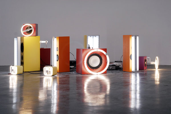 10 enceintes, tubes fluo, amplificateurs, lecteurs CD, bandes sonores