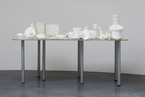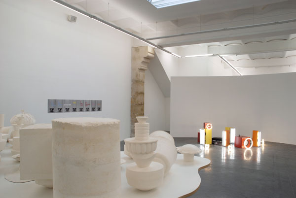 Dans le second espace, deux sculptures se font face. L'une est sonore (Sons, 2002), l'autre est, de manière plus classique, un ensemble de plâtres posés sur une table (C'est Pensé en sons, 2003). Le plateau de cette dernière est découpé comme les deux panneaux précédents, c'est-à-dire selon une forme "patatoïde" que l'artiste affectionne particulièrement et qu'il a souvent utilisée dans des dessins. Les formes en plâtre de C'est pensé en sons sont obtenus par le remplissage de banals contenants (seaux, boîtes, bouteilles, pots etc.) qui ont été superposés les uns aux autres sans anticipation du résultat final, et produisant par ce procédé comme des "sons en élévation". L'accumulation sur la table et la matière blanche du plâtre produisent un résultat de son "concentré" (évidemment !), lourd et sourd, proche d'un effet de basse. Au contraire, les enceintes colorées de Sons, agrémentées de la variété formelles d'ampoules électriques achetées dans des magasins de luminaires, et qui semblent s'accoler de manière paradoxale et comique à leurs improbables pieds-socles, offrent des sons diffus et comme vaporisés dans l'espace, qu'elles étendent en nous tirant doucement l'oreille ! Complétant ce subtil duo de figures opposées mais complémentaires, les Sons d'images réalisés cette année montrent d'un côté des haut-parleurs avec des textes, et de l'autre des haut-parleurs avec des images. Textes et images introduisent encore et toujours le bruit du quotidien, la nourriture, les publicités, les slogans, les partis, la culture savante ou populaire, les annonces, les mots d'ordre, les écrans de toutes sortes, le travail, le réel matériel, les conversations de toutes natures, les petits et les gros titres qui forment la rumeur du monde, mais aussi, plus subrepticement, le désagréable ronflement que l'on peut entendre aujourd'hui gonfler dans l'espace public, lorsque l'on a l'oreille un peu fine.