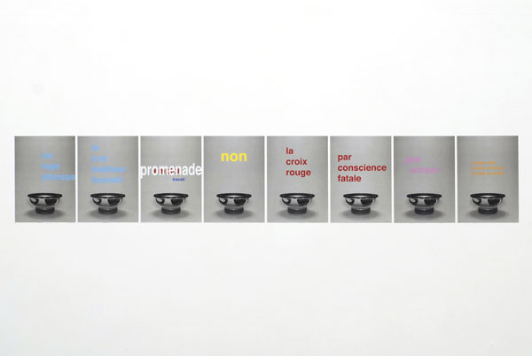L'exposition proposée par l'artiste au Frac Languedoc-Roussillon est la première tentative de montrer certaines articulations entre des productions apparemment très différentes les unes des autres. De l'espace de la cuisine à celui de l'atelier du sculpteur, du studio d'enregistrement aux albums de Tintin, des réalités les plus matérielles aux mots et à leur dimension abstraite, des images trafiquées à un objet récupéré au bord de l'eau ou à ceux d'autres "grandes surfaces", le spectateur est invité à suivre des cheminements formels qui se recoupent en des intersections inattendues, témoignant d'un projet artistique et d'une inventivité où la rigueur formelle et la maîtrise s'accompagnent d'une constante légèreté et volonté d'ouverture.