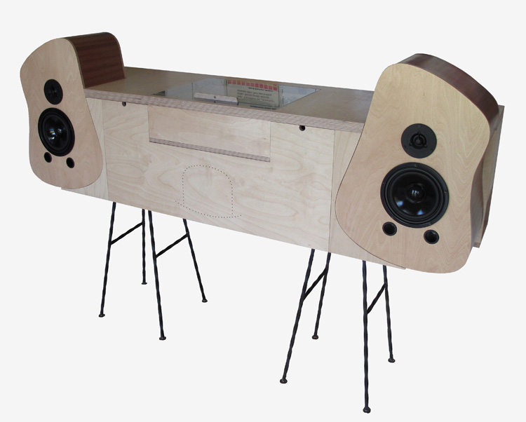Contreplaqué de bouleau verni, placage en sapelli verni, piétements en métal torsadé, capot de la platine tourne disque en Altuglass transparent.