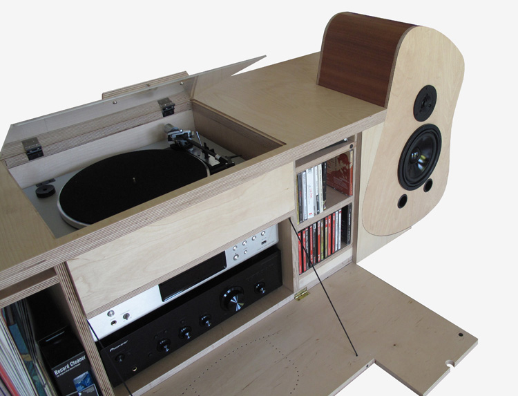 Ce meuble est conçu pour ranger et écouter ou pas, des disques CD et vinyles qui sont tous en relation avec Erik Satie, ainsi que des documents à consulter. C’est une sorte de mini-bibliothèque discothèque qui comprend un système de diffusion stéréo.