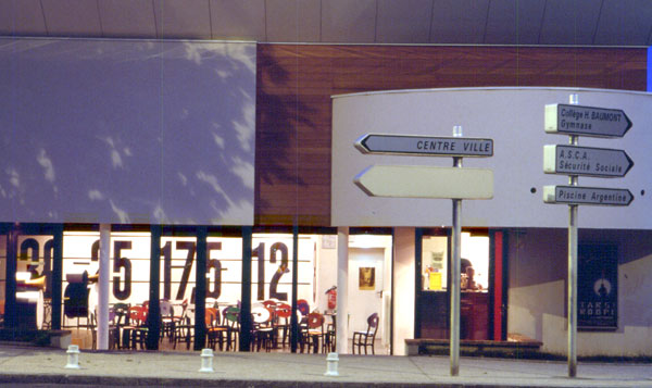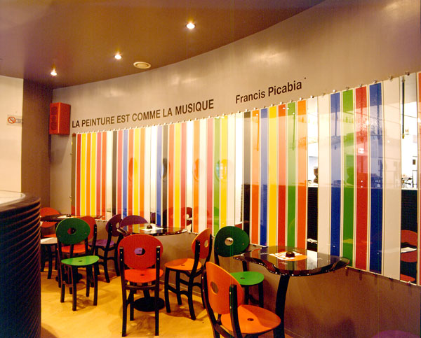 The entire cafe (tables, chairs, bar, sound furniture, acoustic speakers) was conceived by Patrice Carré. Each part of the ensemble refers to objects used for sound diffusion. The graphic writing in the space is black and white, recalling a partition. The profiling of the bar is constituted by a pile of black arcs, in reference to vinyl records. The counter contains vitrines where singular objects for producing sound are displayed. On the wall behind the bar, 60 elements in transparent glass and mirrors compose a row of cds of which one can see the side.