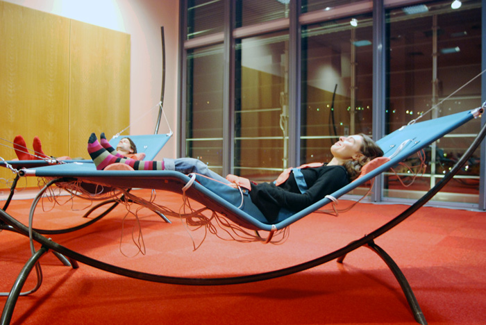 Équipés d’un réseau de 70 haut-parleurs sans membranes, cinq hamacs font circuler des sons sur le corps des auditeurs. Les vibrations rendues perceptibles sur le corps sont transmises à l’oreille par conduction osseuse. Muni de bouchon d’oreilles, l’auditeur perçoit de fines vibrations localisées qui se déplacent sur sa peau en même temps qu’il les entend comme venant de la surface ou de l’intérieur du corps. |