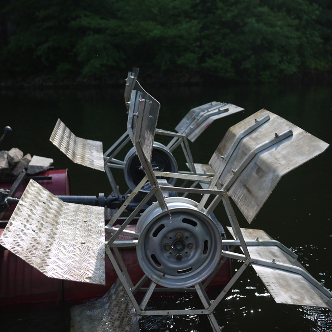 Mini-centrale hydraulique, hauts-parleurs, bande-son quadriphonique dans le paysage.