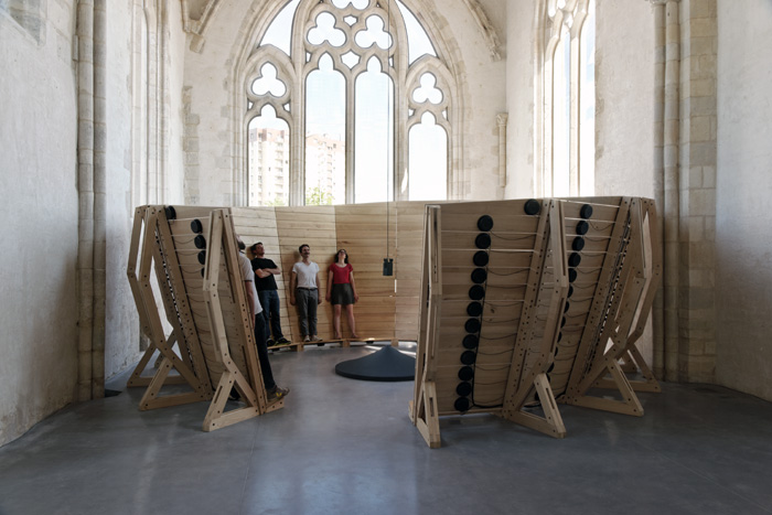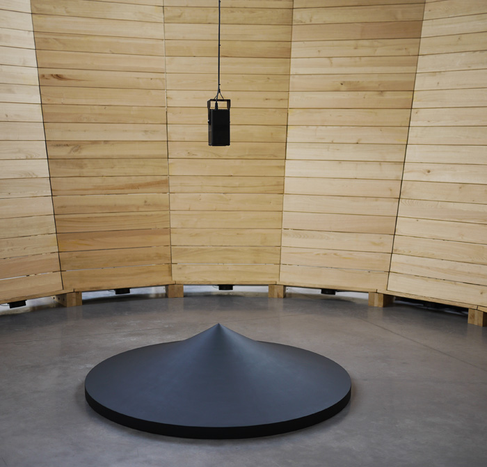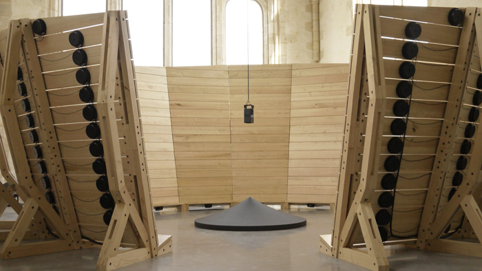 Isotropie de l’ellipse tore met en tension une sculpture en bois et une composition sonore cyclique qui emplit et désemplit l’espace des églises. Le son circule dans le bâtiment et la structure, traçant une trajectoire perçue physiquement par les auditeurs. La sculpture sert de résonateur à la trame sonore via les haut-parleurs vibrants fixés sur la surface extérieure. Simultanément sculpture, lieu et mobilier, le tore compose un temps suspendu avec la circulation d’une vibration qui traverse inlassablement l’église et le corps des visiteurs. |