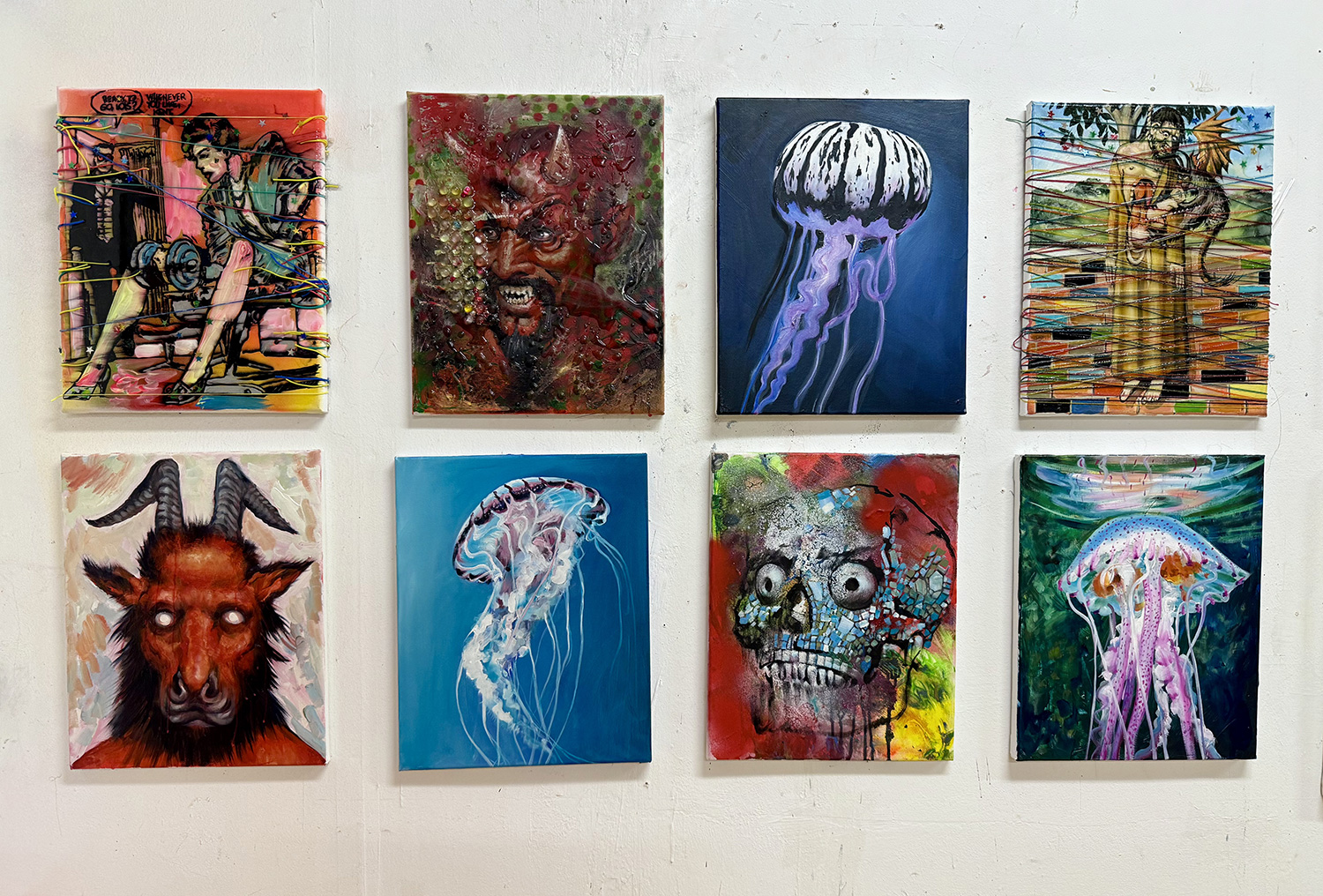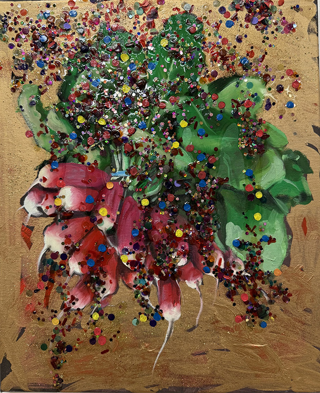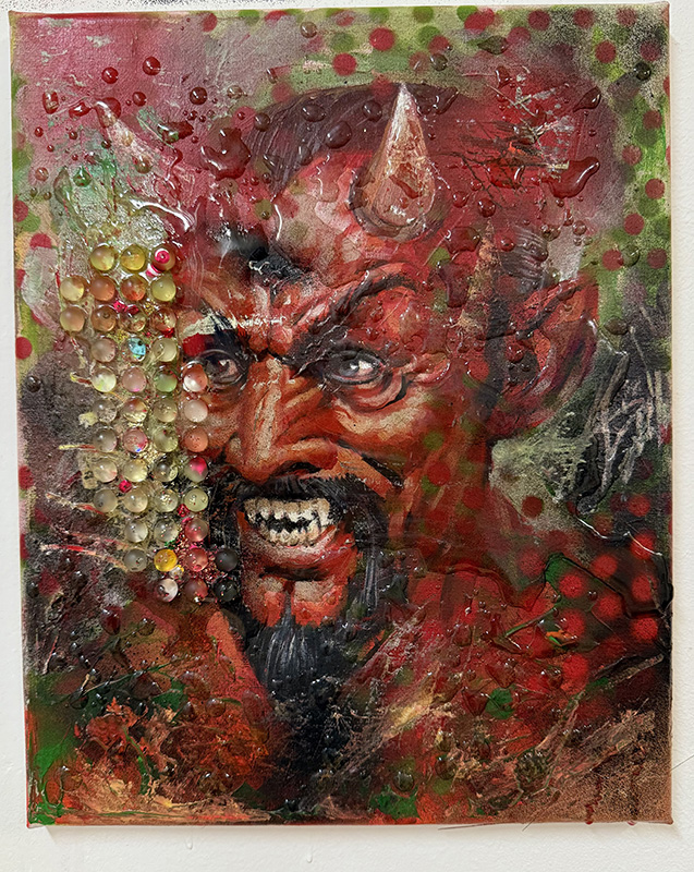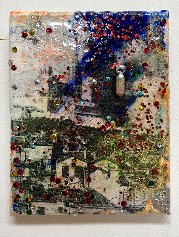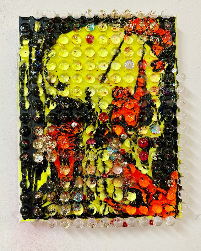 Huile, résine, hameçons, plumes, strass sur toile, 24x19cm |