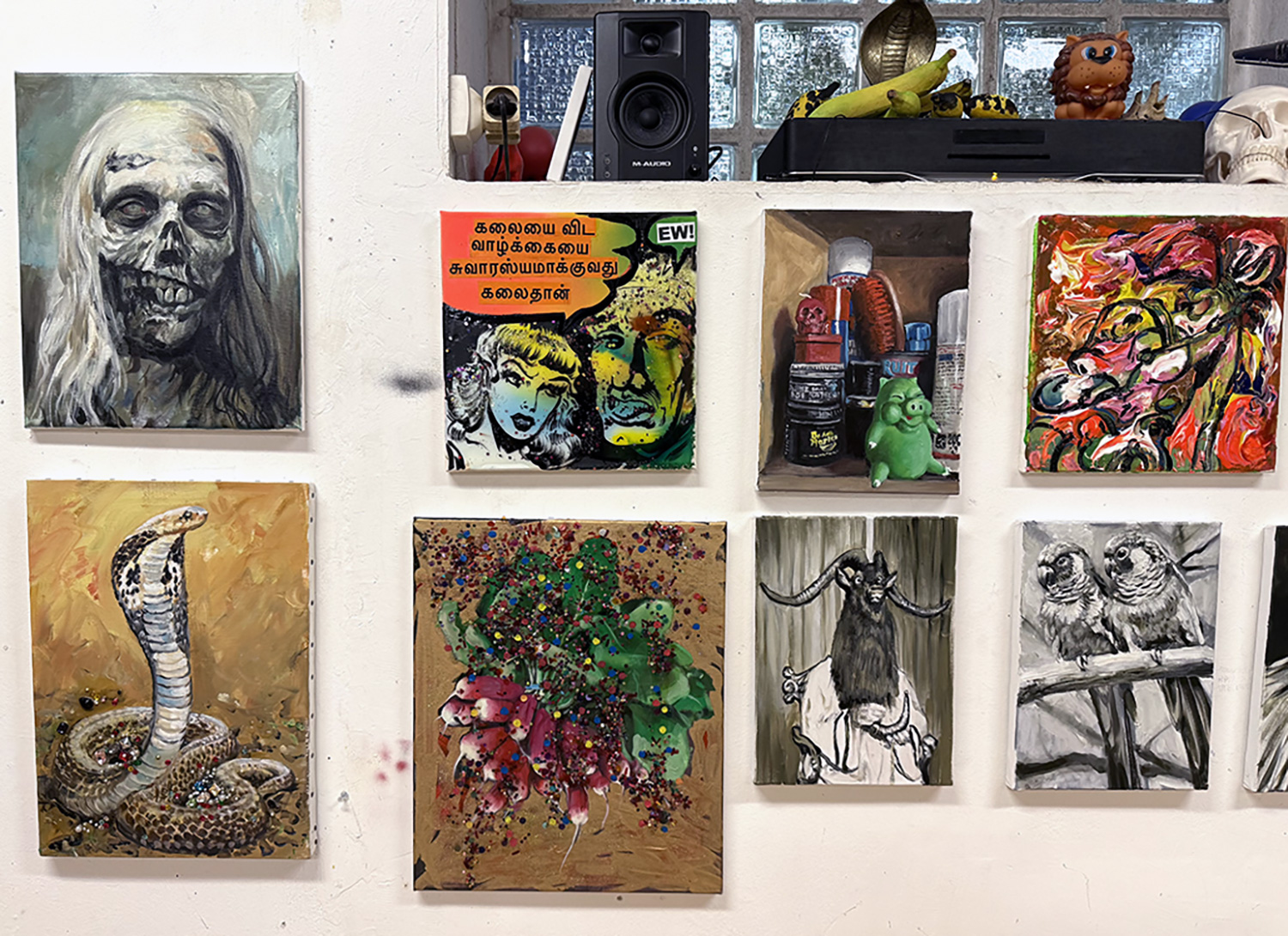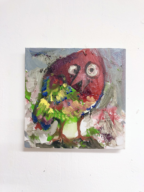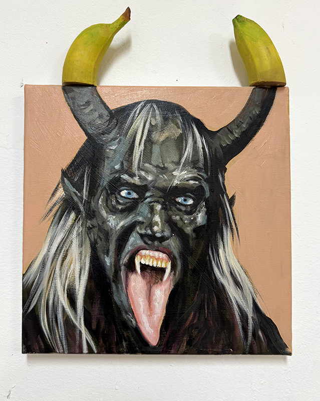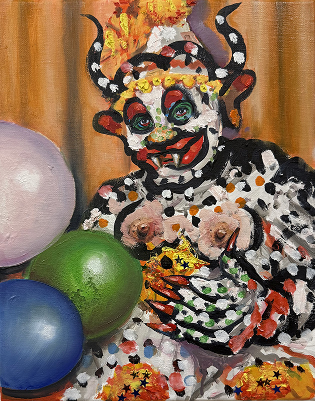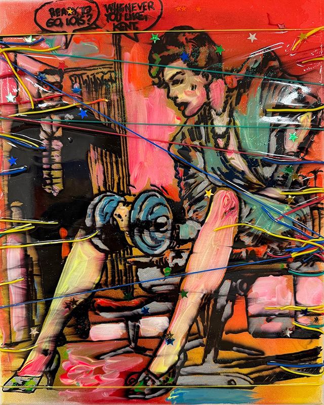 Huile, résine, hameçons, plumes, strass sur toile, 24x19cm |