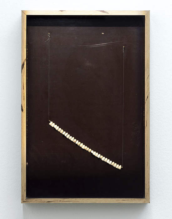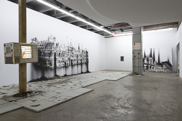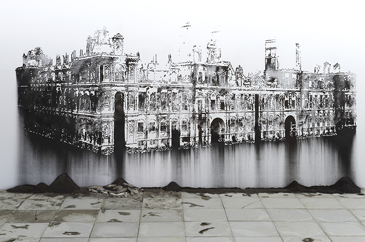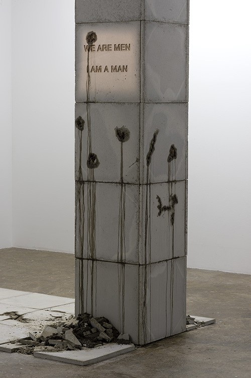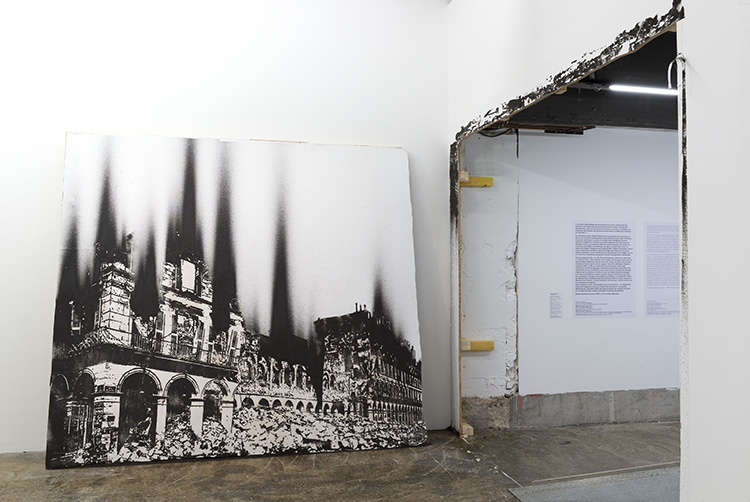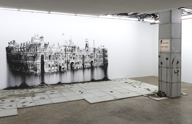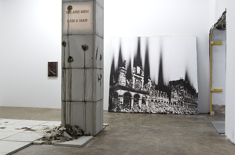 projet est incarné par la voix du rappeur marseillais Akhénaton. Membre du groupe IAM, il prête son timbre à la lecture de textes choisis avec l’artiste, portant les témoignages d’hommes et de femmes confronté.e.s à des expériences de vies contraintes. Au sol, empruntant un procédé de sabotage employé par les résistants, des dalles de béton mélangées à du sucre s’effritent à mesure que les visiteurs circulent. Sur les murs, deux dessins à la limaille de fer semblent se liquéfier. L’un représente l’Hôtel de Ville de Paris, incendié pendant la Commune (1871) et l’autre, retourné, le Palais de Justice. « Aucun bâtiment n’est innocent » disait l’artiste dans une exposition précédente. Deux sculptures, enfin, accompagnent cet environnement : un réfrigérateur embroché, rappelant à nouveau un geste des résistants à l’occupation allemande qui consistait à geler des poutres de bois afin qu’elles se brisent, et un collier de dents, usées à la manière d’une lame de guillotine. |