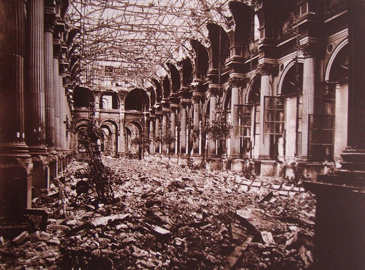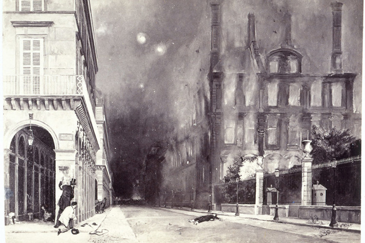 | Paris a été un champ de bataille entre troupes versaillaises loyalistes et communards, du 21 au 28 mai 1871. En huit jours, les loyalistes ont repris la capitale dans le sang. Ici : la rue de Rivoli et le ministère des Finances, au coin de la rue du Luxembourg (aujourd'hui la rue Cambon). |