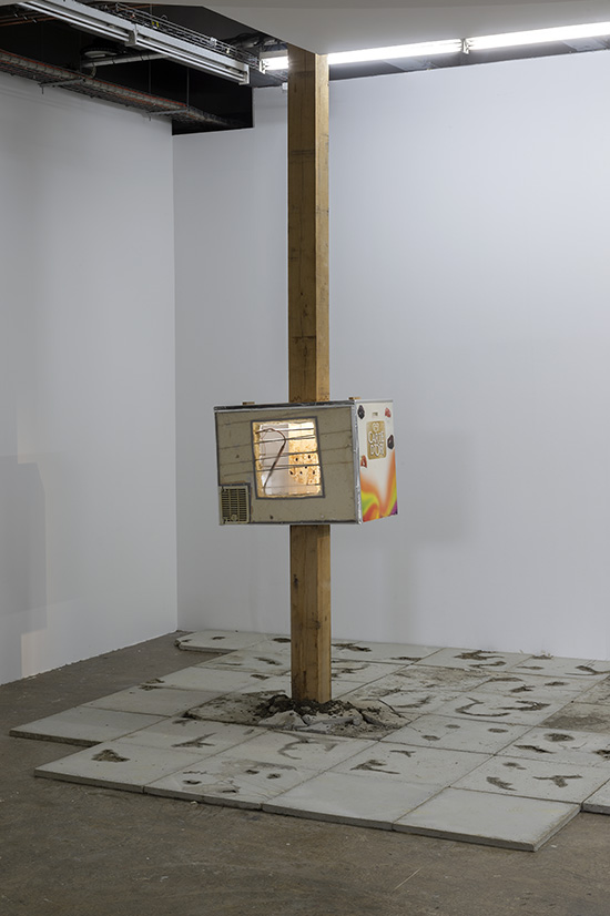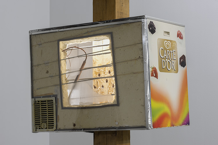 L’installation se compose d’un congélateur embroché par un pilier en chêne. L’appareil électroménager, toujours en état de marche, permet de créer une zone de froid en température négative. La poutre de bois est trouée à plusieurs reprises : l’eau, déposée dans les trous, gèle ; la glace se dilate et vient briser les fibres du bois.