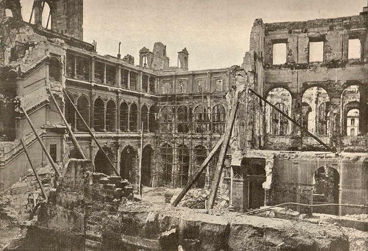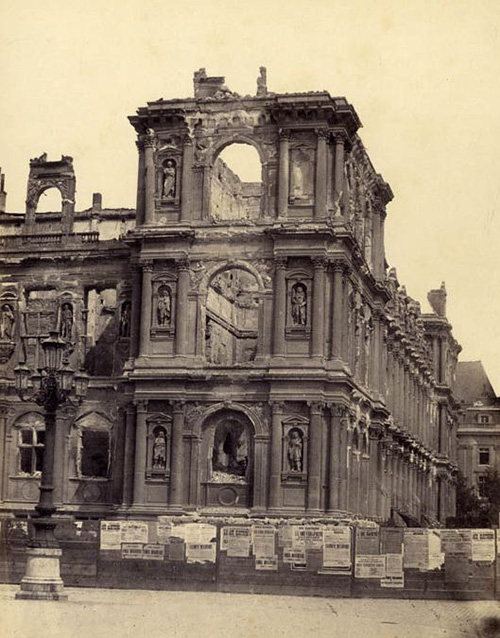 Achevé en 1628 sous le règne de Louis XIII, ce Palais fut un lieu politique important. Il abrita entre autres le Comité de Salut public entre 1792 et 1794, ainsi que le gouvernement provisoire de Lafayette après la chute de Charles X en 1830. Le 28 mars 1871, après la défaite de Napoléon III contre la Prusse, le peuple de Paris s’insurge contre le régime et envahit l’Hôtel de Ville. C’est le début de la Commune. Les insurgés en furent rapidement chassés. Cependant, durant la semaine sanglante (22-28 Mai), un certain nombres de monuments Parisiens seront délibérément incendiés par les Communards et en particulier tout ceux qui possédaient un rapport avec l’image du pouvoir. Ce fut le cas de l’Hôtel de Ville qui brûla le 24 Mai. Avec cet incendie, les archives et la bibliothèque de l’hôtel de ville partiront également en fumée. Les deux collections d’État civil parisien antérieures à 1860 seront également perdues à jamais: la première demeurait dans l’hôtel de ville et la deuxième dans le palais de justice (qui fut également incendié). Suite à cet incendie, l’Hôtel de Ville de Paris était détruit à un point tel que ses ruines ne pouvaient pas être utilisées pour la reconstruction. C’est donc un monument entièrement nouveau qui fut élevé de 1874 à 1882. |