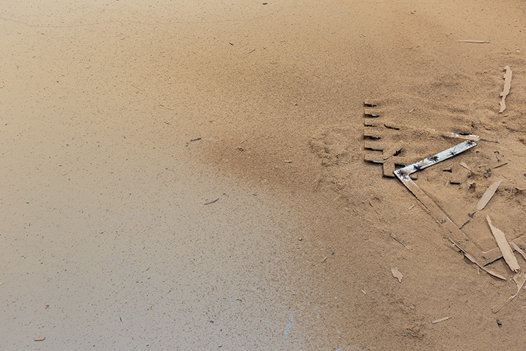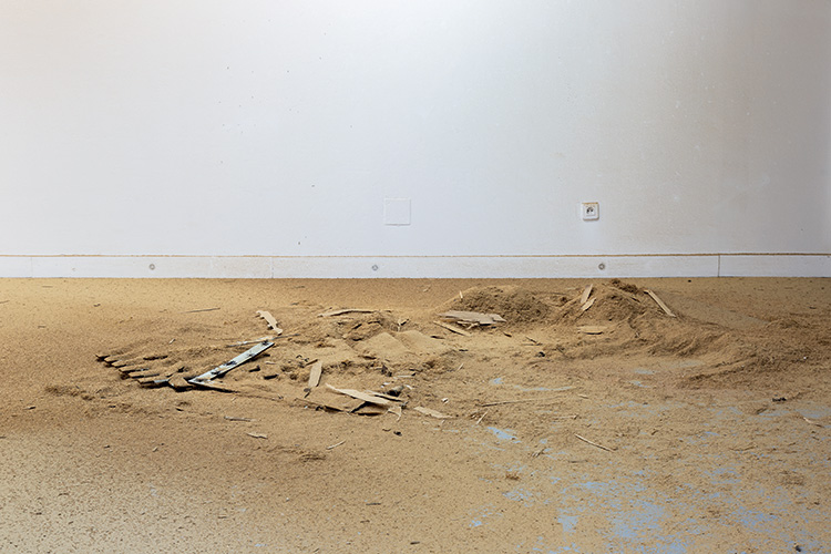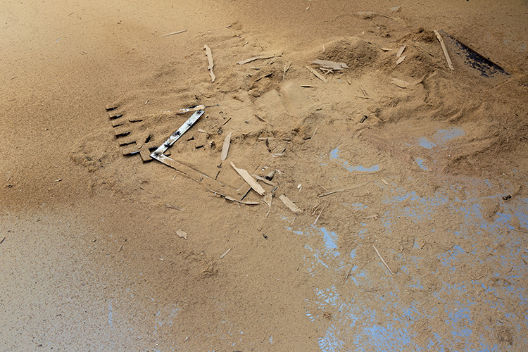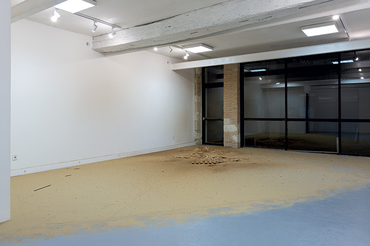 Ainsi, l’objet renvoie à la part manquante, mais il s’agit moins de cette absence que de la fonction qui lui est attribuée. Le statut d’œuvre hypostasie les représentations habituelles de porte en les déplaçant dans une situation inattendue qui se veut artistique. Les signes de réduction agissent comme le squelette de l’œuvre, dont l’élasticité est subordonnée au contenu de l’image, mais aussi aux plans et aux espaces d’exposition. La verticalité dévolue aux œuvres est forcée à une certaine horizontalité par la présence au sol de la poudre. Le croisement des plans contribue à montrer avec la nostalgie de l’abandon que le sol est partie intégrante des sites du regard. Si l’on souhaite filer la métaphore, on irait jusqu’à citer que lorsqu’un individu est au tapis, on le considère symboliquement de haut, en troquant nos plans scopiques habituels. au sol, telle une archéologie à l’opposé de sa position usuelle.
