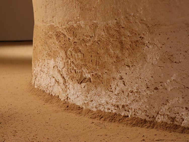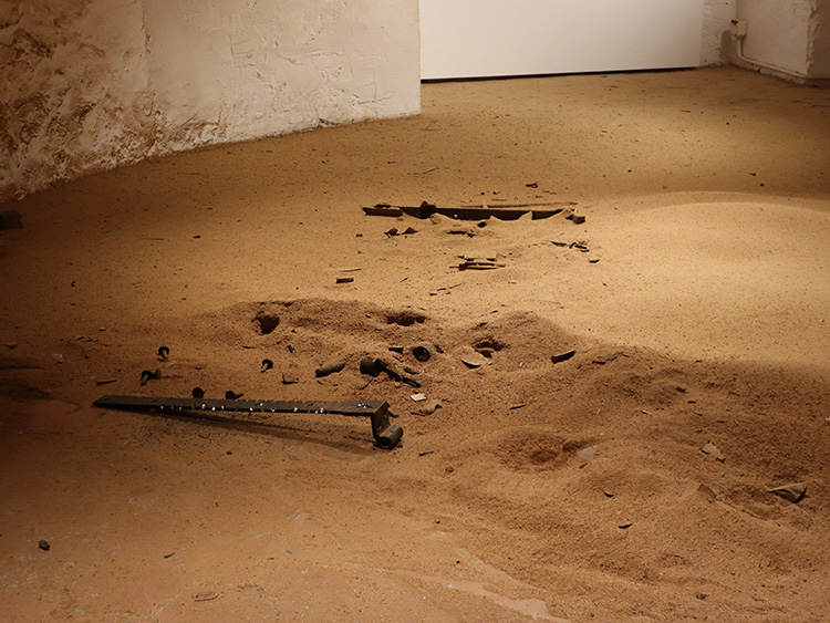 L’artiste a choisi de réduire en poudre une ancienne porte de prison, non pas en la passant dans une broyeuse quelconque, mais en la sciant minutieusement, millimètre par millimètre, jusqu’à la faire disparaître et la transformer en un tas de sciure qui s’apparente à un pollen. Il présente aussi une forme sadique de destruction de la douleur, procurée par l’enfermement, qu’il réduit à néant, sans que quiconque puisse intervenir.