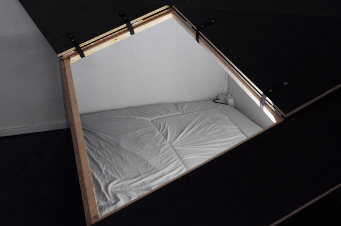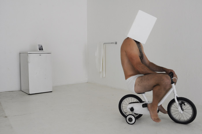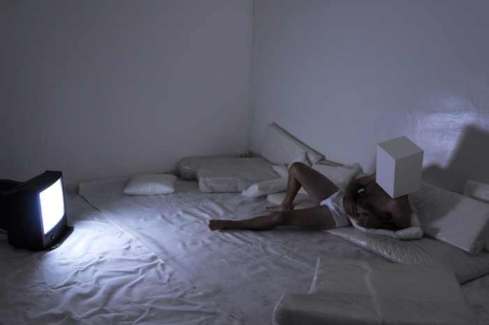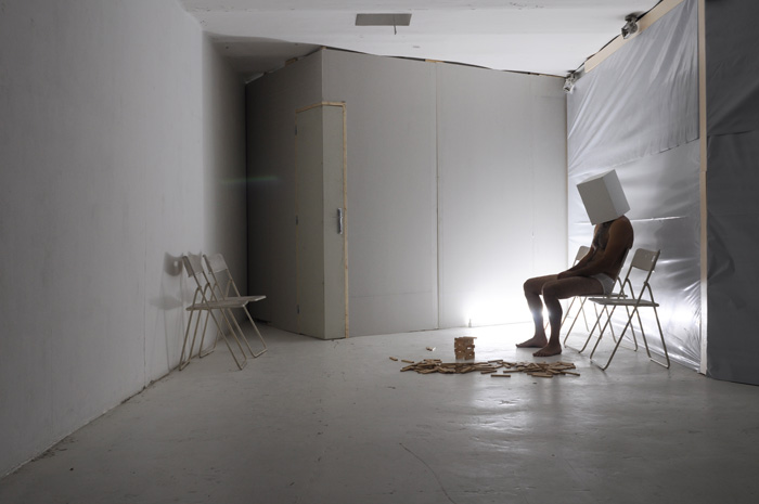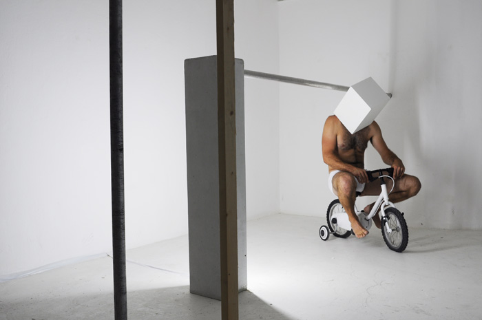 Un univers ambigu s'impose à nous: blanc, calfeutré, à moitié fini. Un personnage vêtu d'une simple culotte blanche et casqué d'un cube blanc hante les lieux, et y développe des pratiques singulières. |