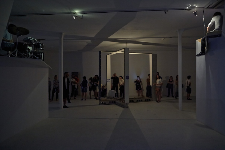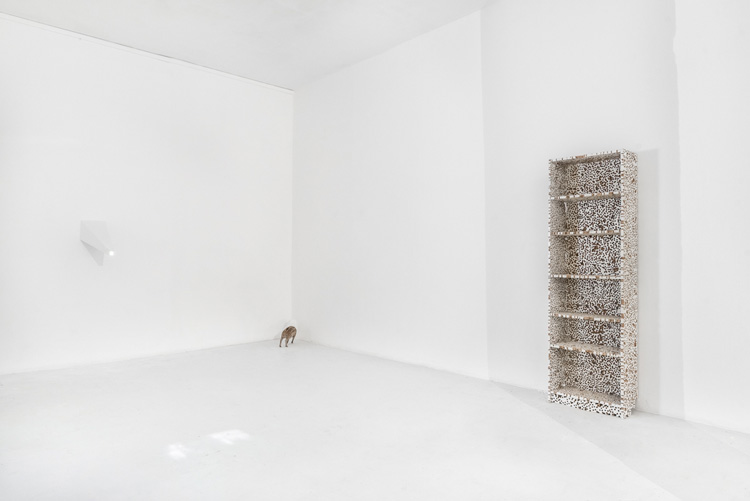 Autour de la chambre, gravitent des objets hétéroclites qui semblent sortir d’un rêve et entretiennent une atmosphère étrange. Certains ont été expulsés, ils ont dérivé dans l’espace, comme le lit ou le tapis qui servent de support au duo de musiciens Postcoitum que l’artiste a invité pour une performance lors du vernissage et avec qui il partage un univers commun.