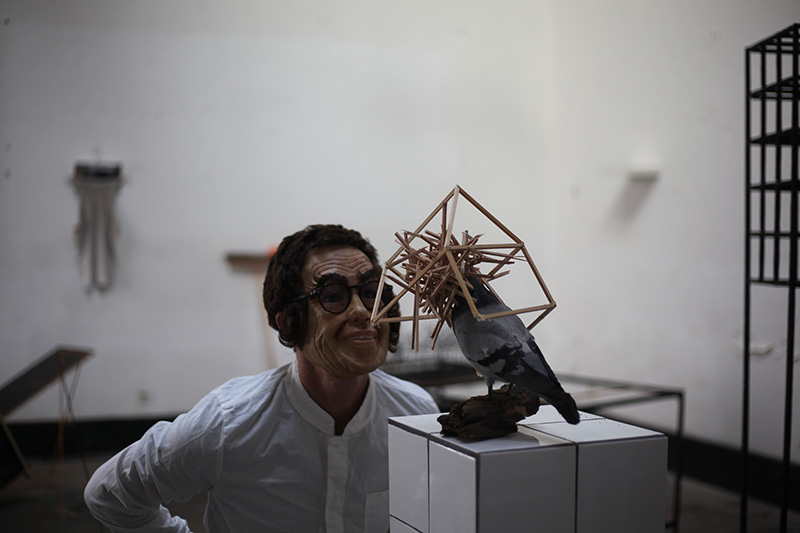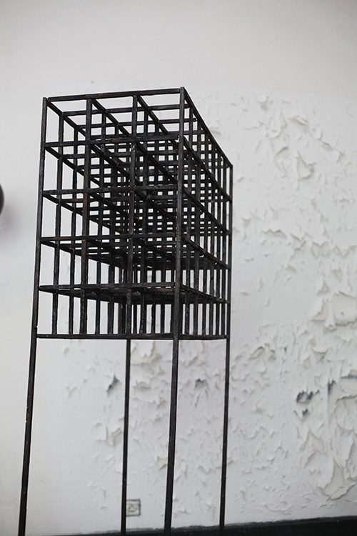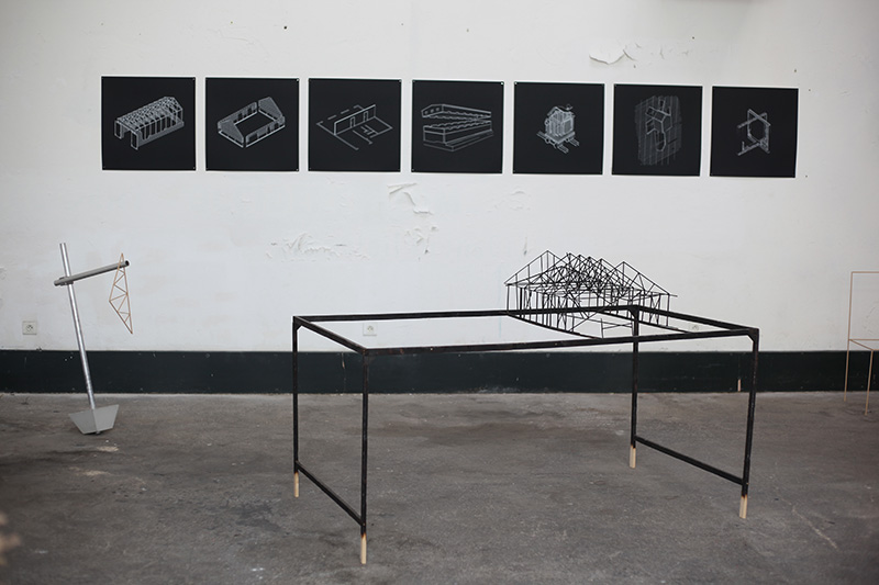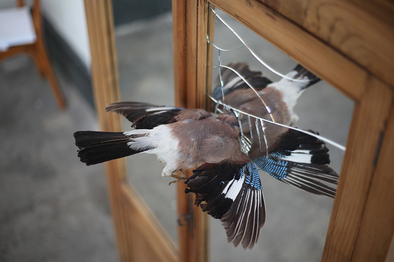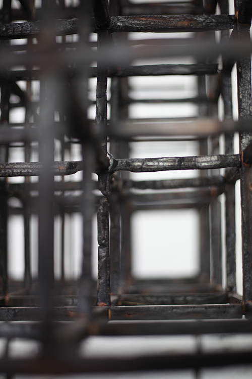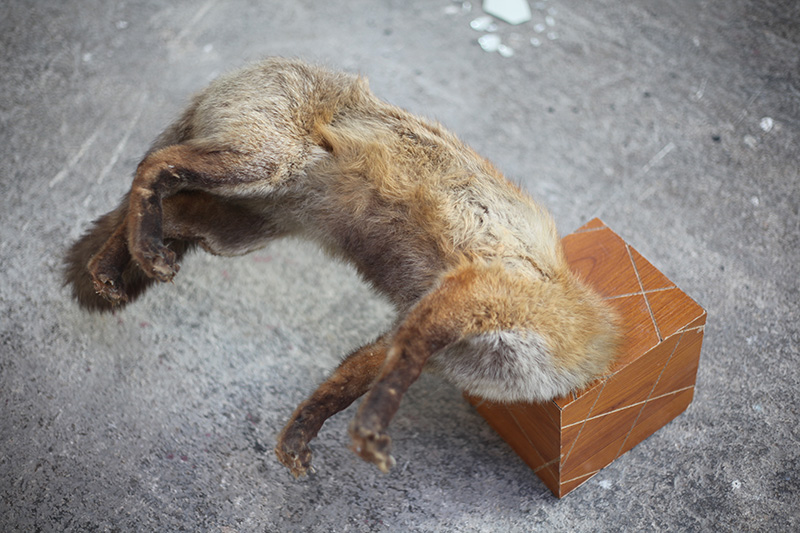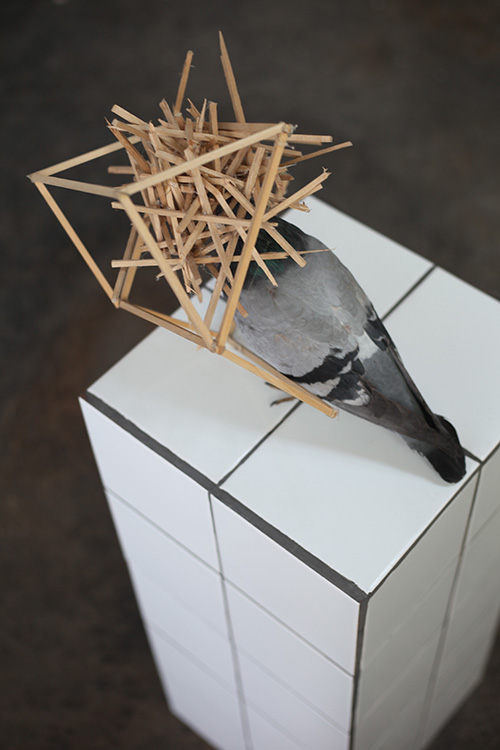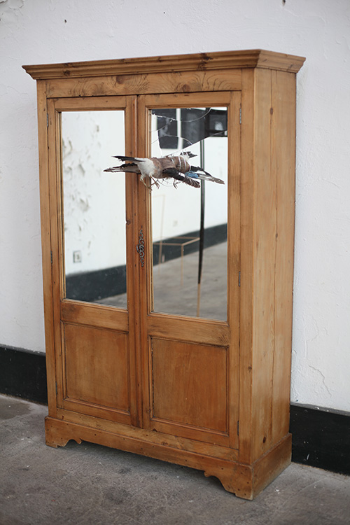 De cette double influence, j’ai travaillé à de nouvelles sculptures qui empruntaient à l’univers architectural tout en étant dévoyées de leurs usages premiers. Des maquettes de ruines en bois brûlé, fabriquées à l’échelle de mobilier. Des blocs sanitaires en guise de socles, dans lesquels se plantent des animaux naturalisés. Une armoire percutée par un geai.