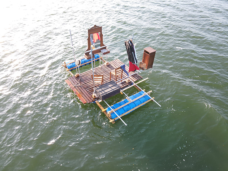 J’ai donc pensé mon radeau comme une forme hybride, sculpturale ou plutôt comme une sorte de décor flottant, un décor pour un personnage en prise avec sa propre quête intérieure. En plus des nombreux éléments récupérés sur la base nautique, j’ai emporté des éléments de mobilier traditionnel chinés autour de l’étang (coiffeuse, table de chevet, chaises et penderie) pour les suspendre en quelque sorte au-dessus de l’eau, accrochés à des tubes de métal comme des extensions, des prothèses.