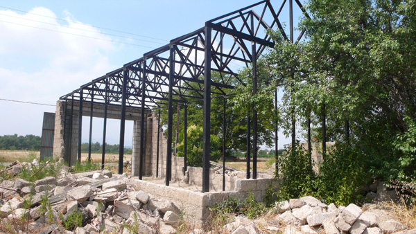 Une charpente brûlée sur le modèle des maisons standards PHENIX sort des décombres du hangar en ruine. Cette ossature fragile dessine une maison entre deux états, une ruine construite qui émerge d’une autre.