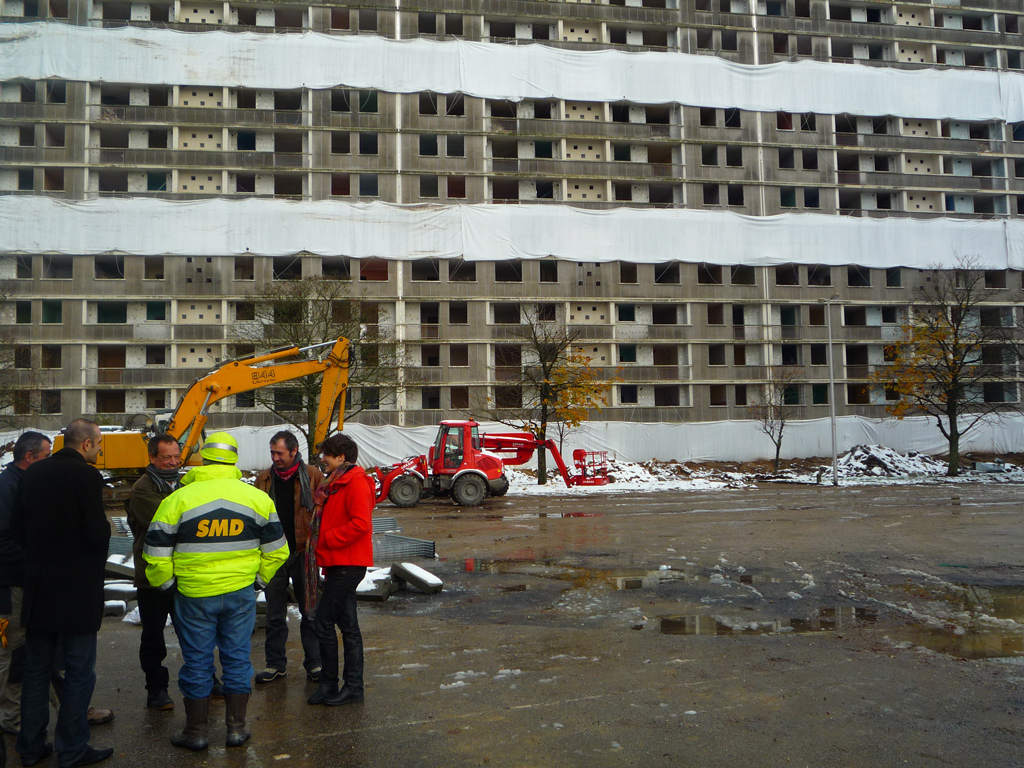 Visite du chantier de démolition par foudroyage intégral des deux tours Gauguin à Limoges, le 27 novembre 2010. Démolition des Blocs 47 et 49 de la rue Pissaro, le 28 novembre 2010.