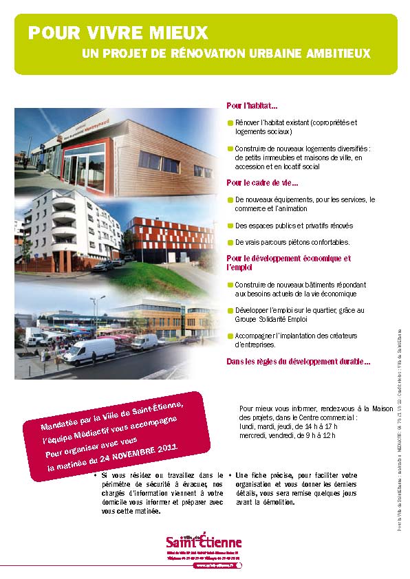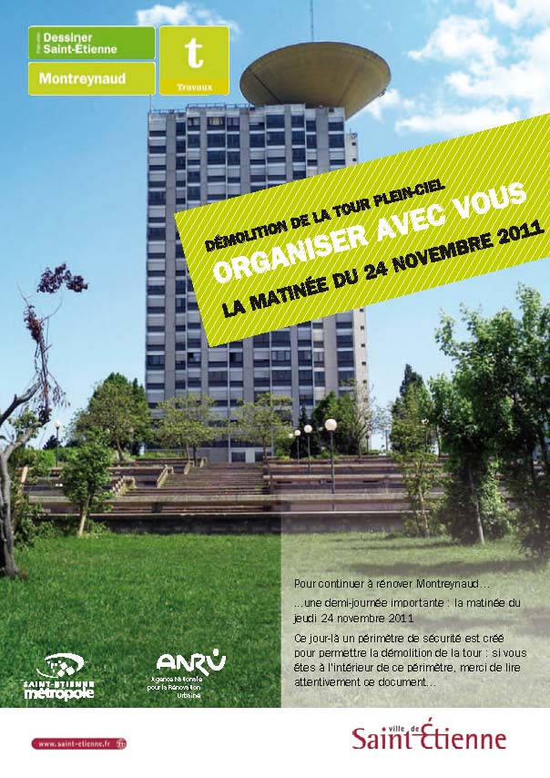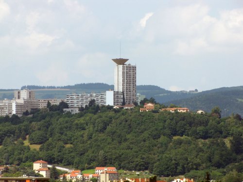 Built in 1970 by architect Raymond Martin and visible from the four cardinal points of the city, the main feature of this tower is to be topped by a funnel shaped water tank. It was originally scheduled to be destroyed in 2008 according to the ’Grand Projet de Ville’ prerogatives which is part Montreynaud. But the new majority after municipal elections in March 2008, has suggested the hypothesis of its transformation into a work of art, with the loss of its habitation function for the benefit of its function as a symbol. A popular consultation of the inhabitants of the area about the becoming of the tower took place on the 27 june 2009. The people finally expressed their will in a vast majority of 73% for its demolition, which will accordingly will be effective on the 24 november 2011.