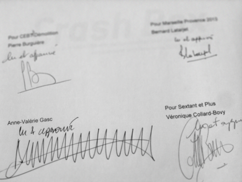 Réunion de l’ensemble des partenaires de l’Atelier de l’Euroméditerranée Crash Box pour signature de leur convention, le 7 janvier 2011. Le projet Crash Box lie pour une durée de trois ans (2011 – 2012 – 2013), MP 2013 (le producteur), Sextant et Plus (le producteur délégué), Gasc Démolition (l’artiste) et GINGER - CEBTP DÉMOLITION (l’entreprise).