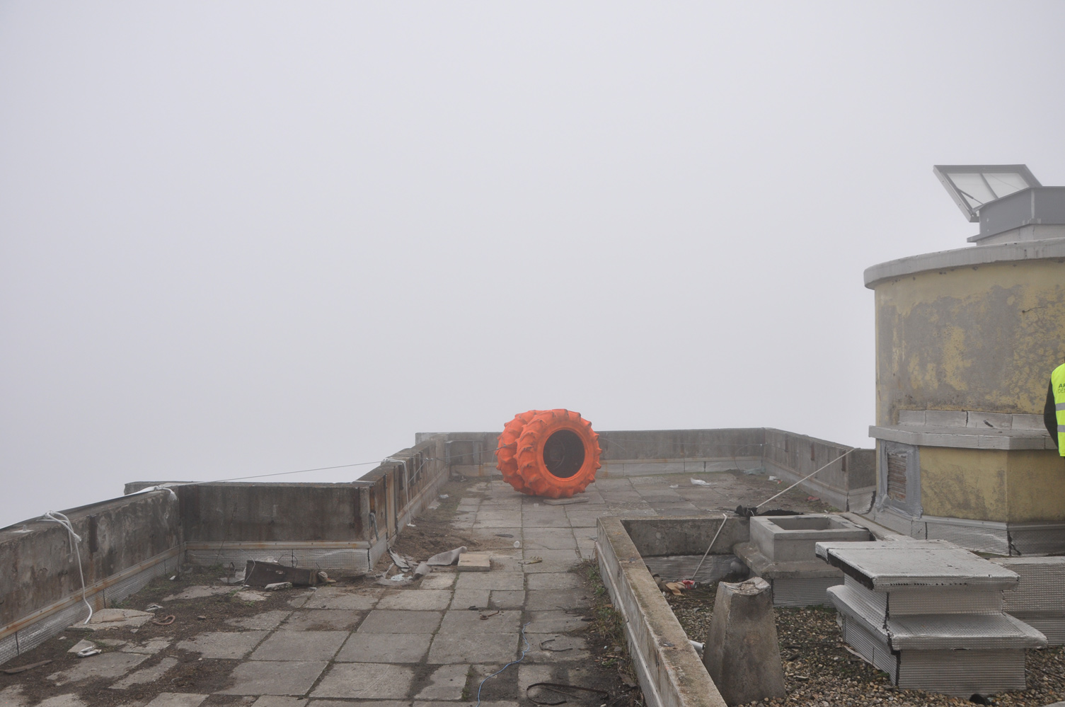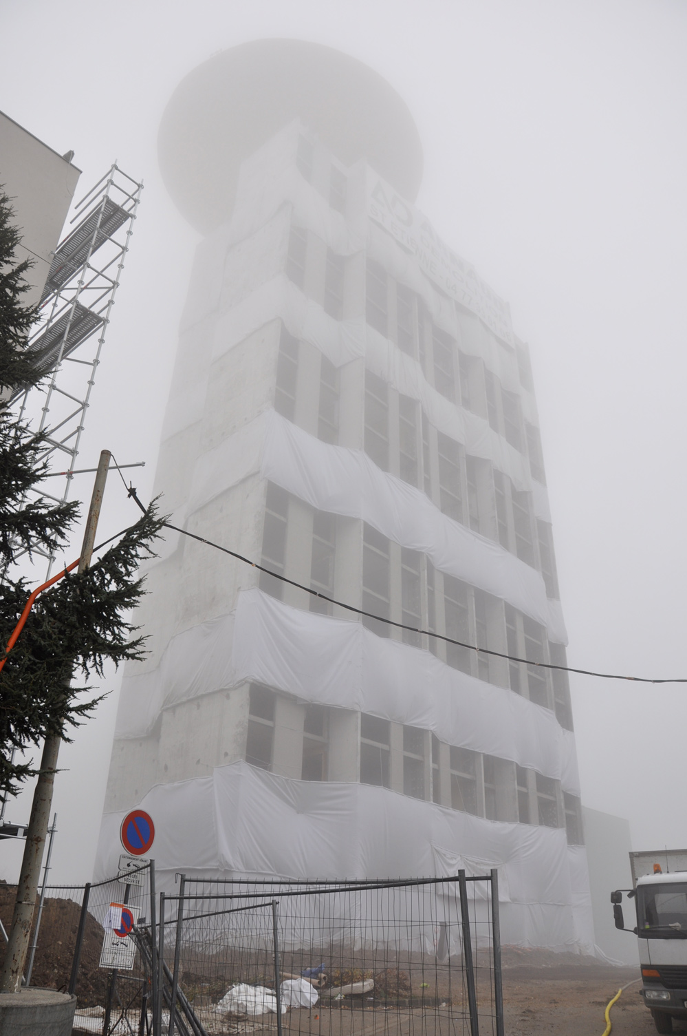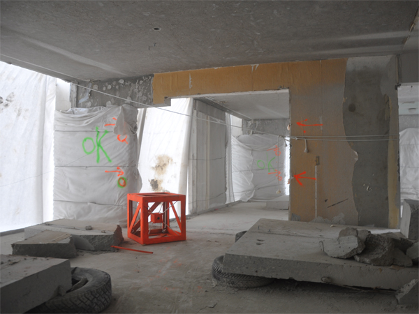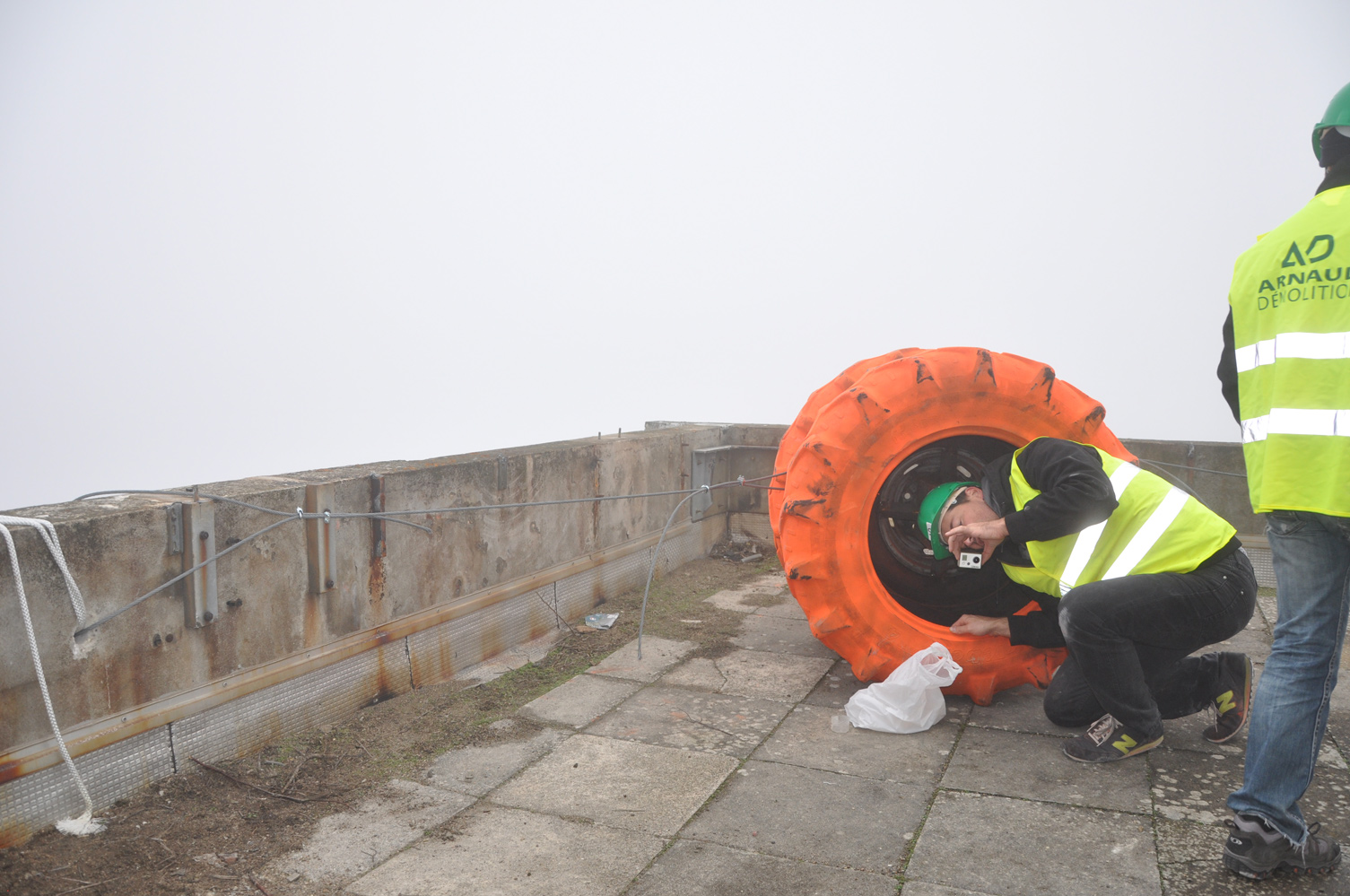 L’équipe Crash Box est arrivée sur le site de la Tour Plein Ciel la veille de son foudroyage. La visite de chantier a été consacrée à la vérification des emplacements des crash box, le placement des noyaux en mousse à l’intérieur des boîtes blindées destinées à recevoir les caméras et l’ajustement des cadrages. Au moment de quitter le chantier, la tour avait complètement disparue, dissimulée sous une épaisse brume, comme si seule la vue intérieure de la démolition s’apprêtait à subsister pour le lendemain...