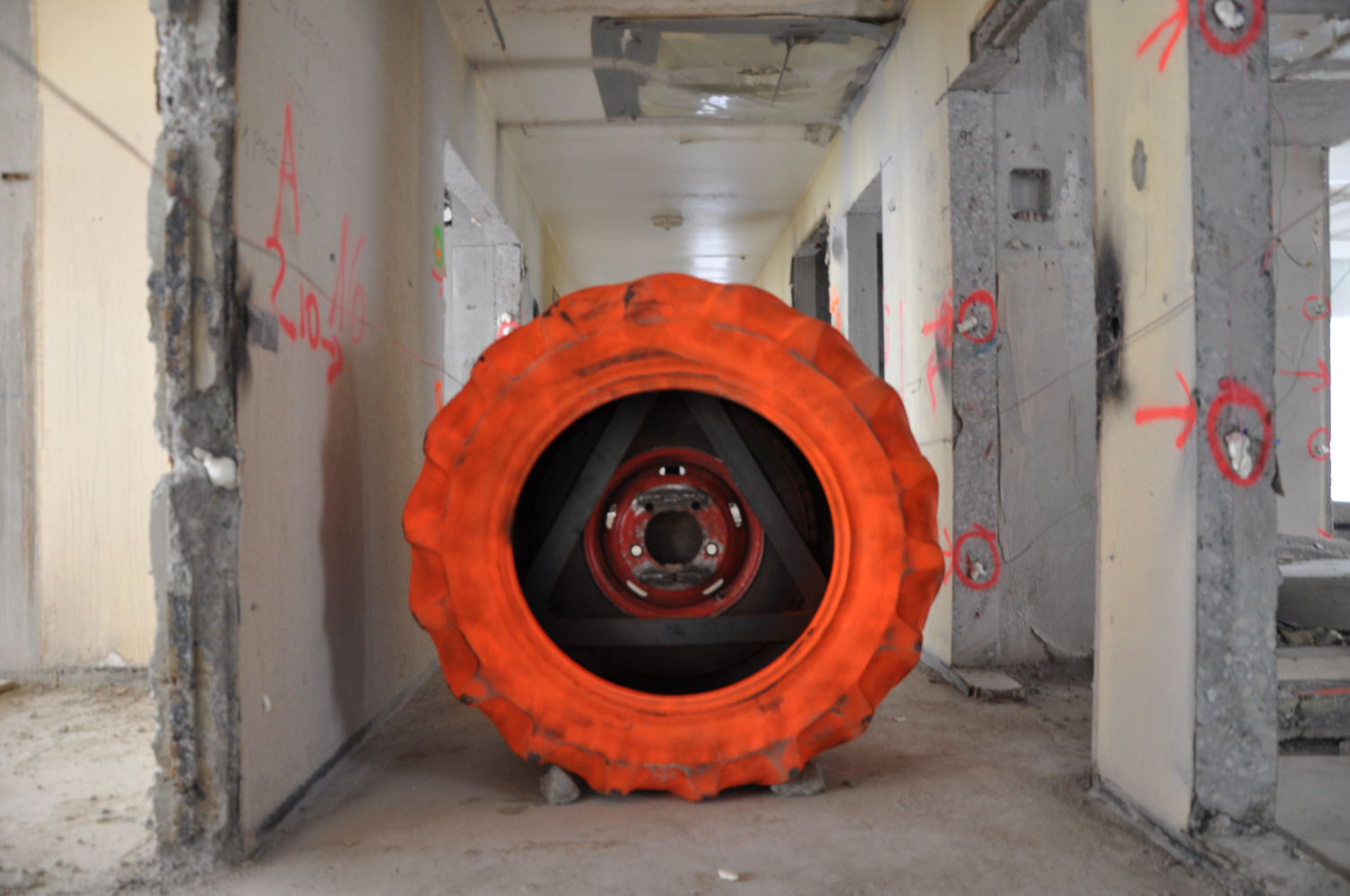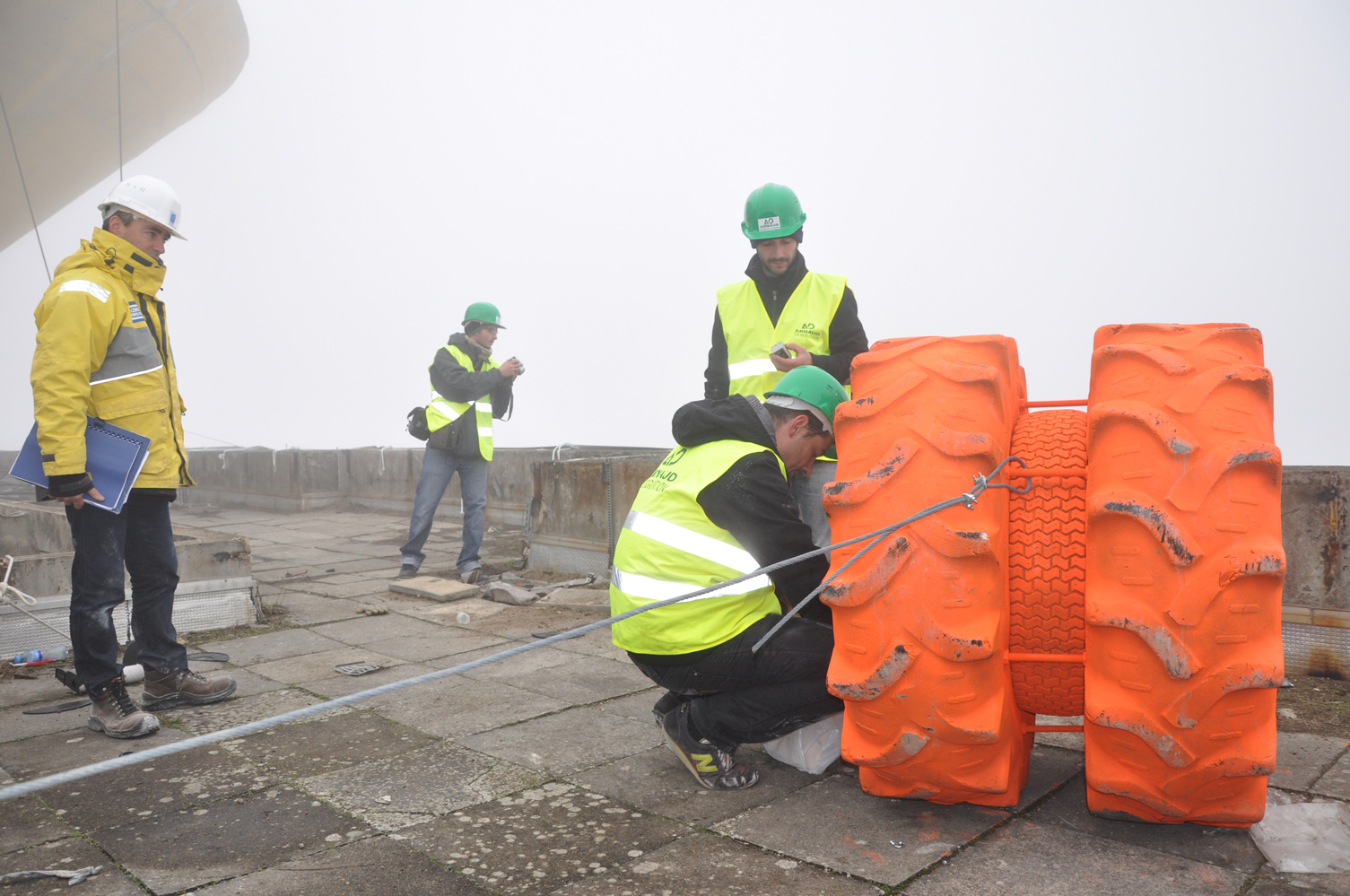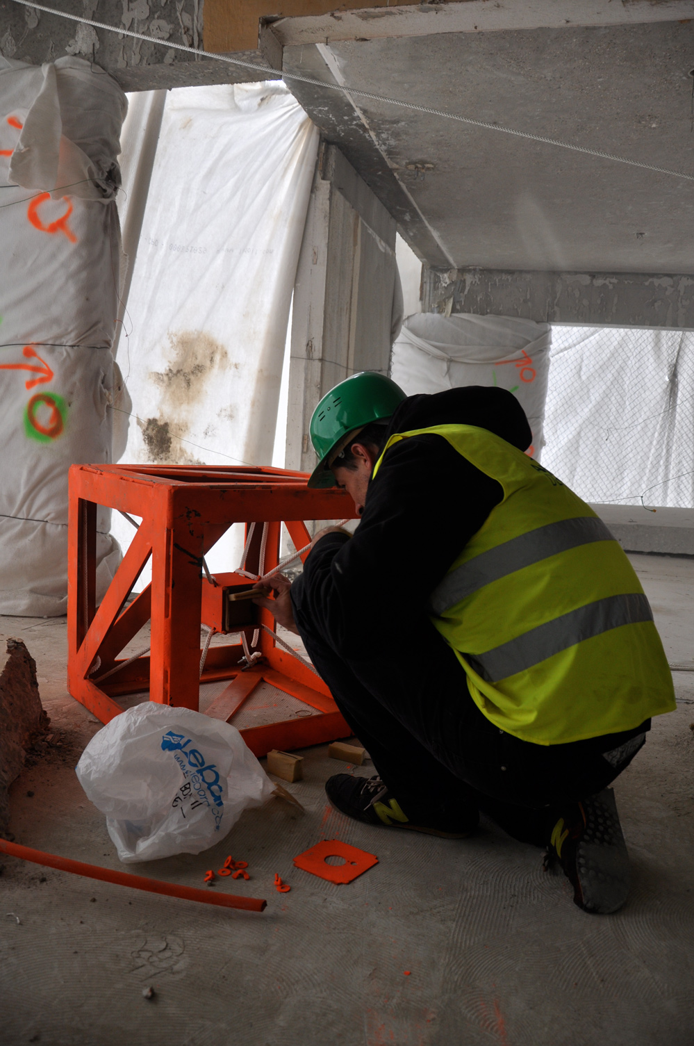 L’équipe Crash Box est arrivée sur le site de la Tour Plein Ciel la veille de son foudroyage. La visite de chantier a été consacrée à la vérification des emplacements des crash box, le placement des noyaux en mousse à l’intérieur des boîtes blindées destinées à recevoir les caméras et l’ajustement des cadrages. Au moment de quitter le chantier, la tour avait complètement disparue, dissimulée sous une épaisse brume, comme si seule la vue intérieure de la démolition s’apprêtait à subsister pour le lendemain...